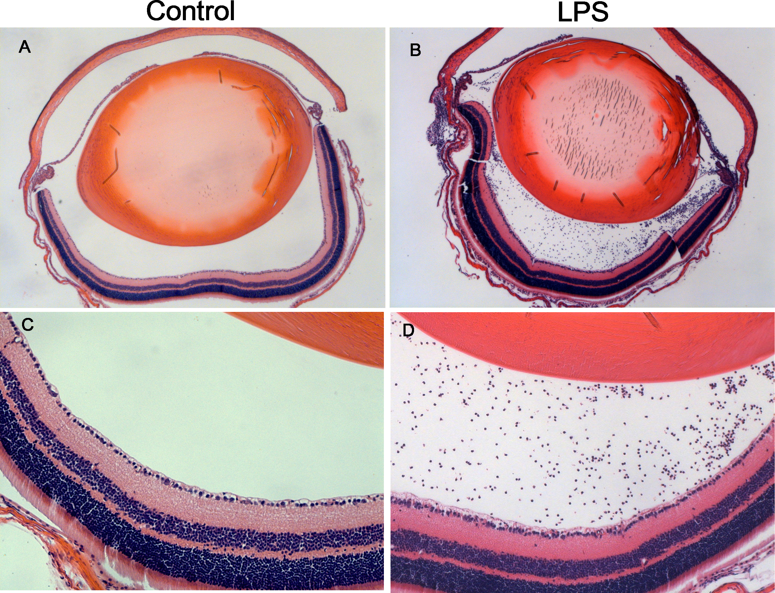 Figure 2. Histological evaluation of the eyes from the mice treated with or without LPS. Representative images (A, C) show infiltrating inflammatory cells in the posterior chamber of the eyes in the control group at the 24th hour. Representative