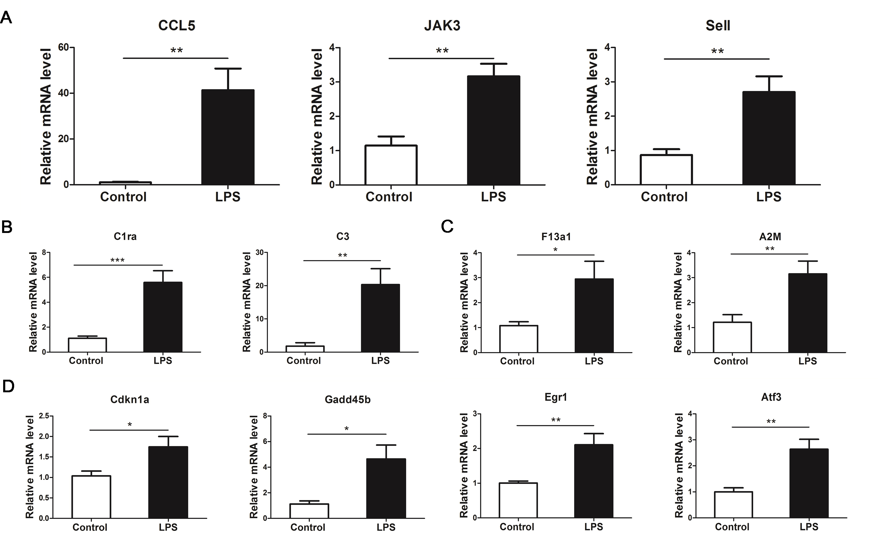 genes (Ccl5, JAK3, and Sell; A), complement system–related genes (C1ra and C3; B), fibrinolytic system–related genes (F13a1 and A2m; C), and cell stress–related genes (Cdkn1a, Gadd45b, Egr1, and Atf3; D) were remarkably higher in the lipopolysaccharide (LPS) group compared with the control group (*p<0.05, **p<0.01, ***p<0.001,