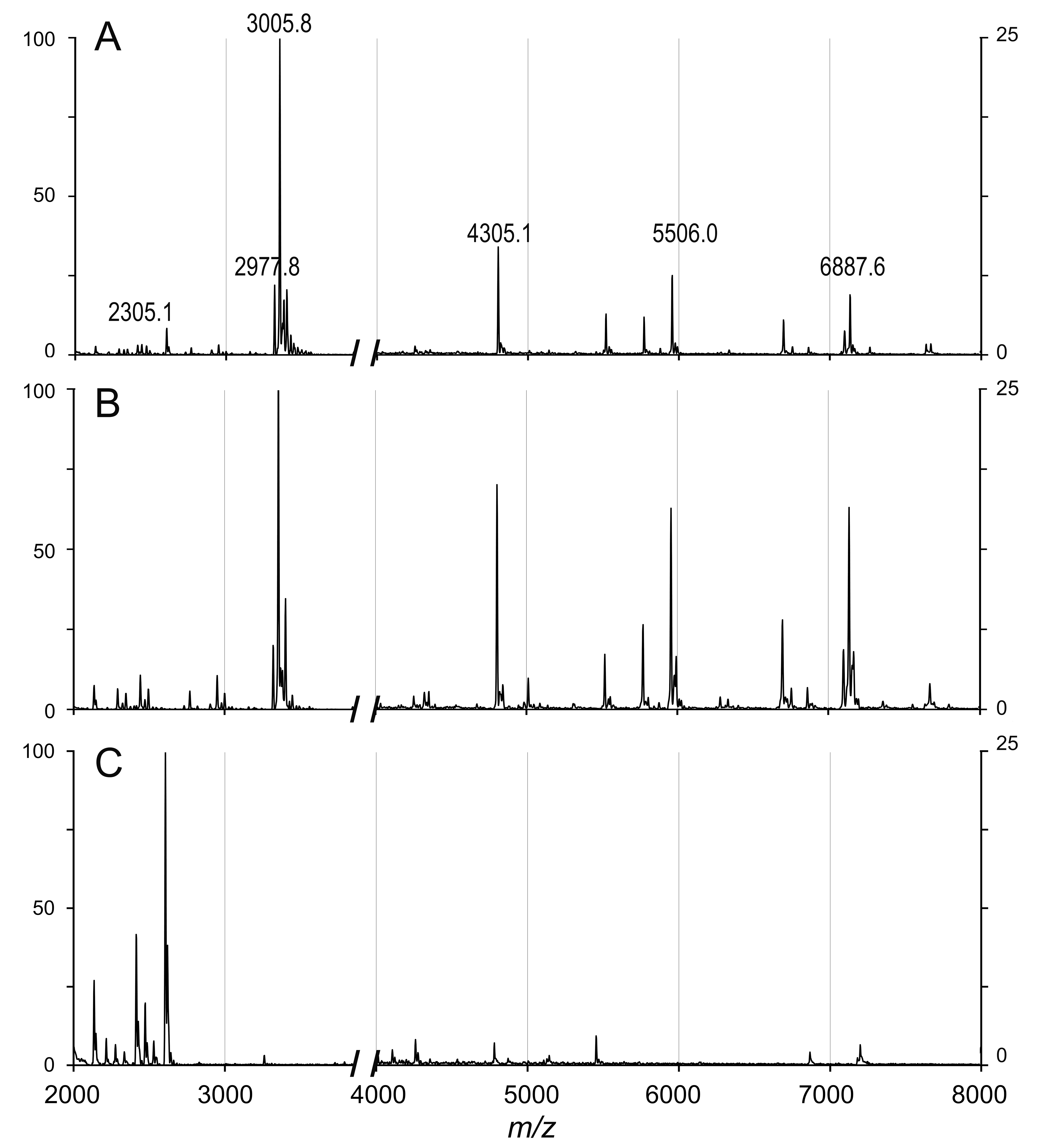 Figure 1. Mass spectra of vitreous, Staphylococcus aureus, and the mixture of both. The mixture of porcine vitreous and S. aureus (A), S. aureus (ATCC 25923F; B), and vitreous (C) was analyzed with matrix-assisted laser desorption/ionization time of flight mass spectrometry (MALDI-TOF-MS; VITEK MS).