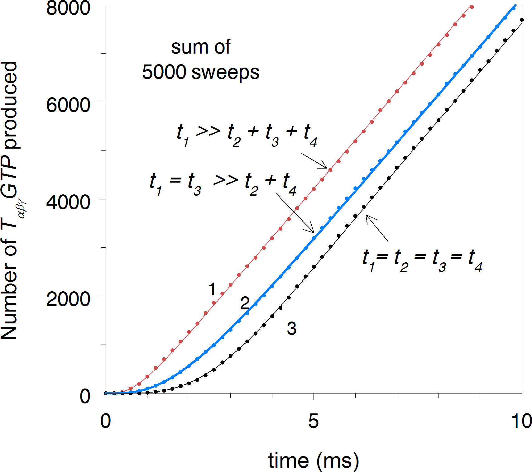 TαβγGTP production delay. A stochastic simulation of the activation cycle was performed fixing the total duration of the cycle (