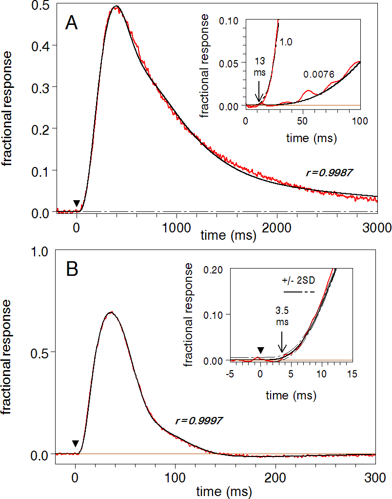 Figure 7. Modeling flash responses of frog rods and red-sensitive cones. The red lines are the experimental recordings; the black lines