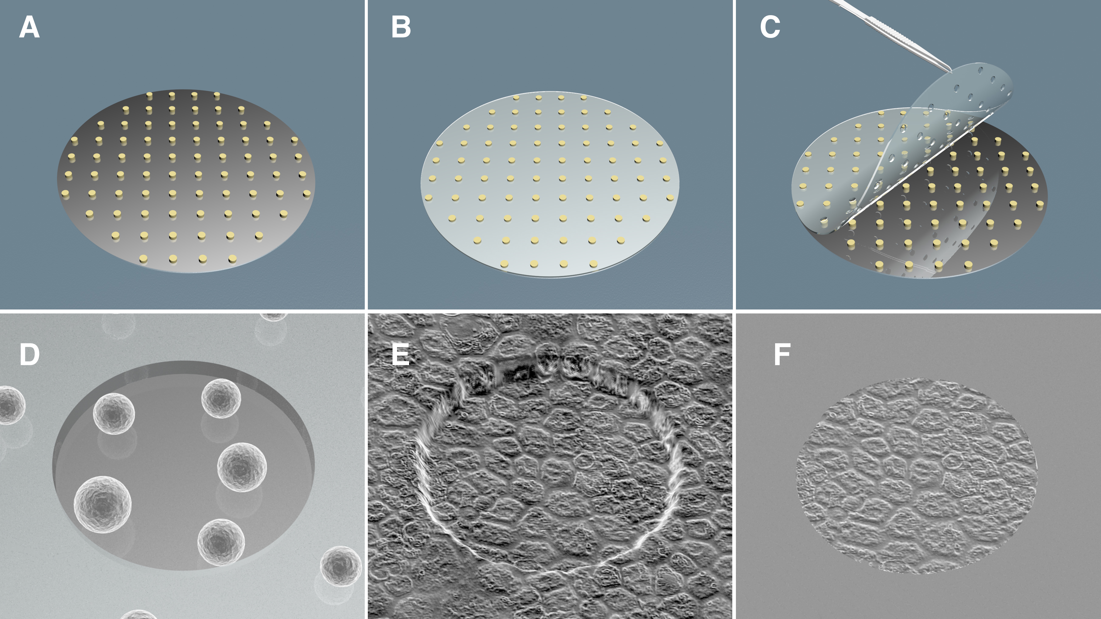 Figure 1. Schematic of PDMS stencil fabrication and micropatterning. A: Microfabricated photoresist pillars on a silicon wafer. B: Polydimethylsiloxane (PDMS) prepolymer spun on a silicon wafer with photoresist patterns. C: Peeling the cured PDMS stencil off the silicon wafer. D: Illustration of cell seeding on the stenciled coverslips. E: Representative schematic of the formation of the RPE monolayer. F: Characteristic circular pattern of the RPE cells after the PDMS stencil is peeled off the coverslip.