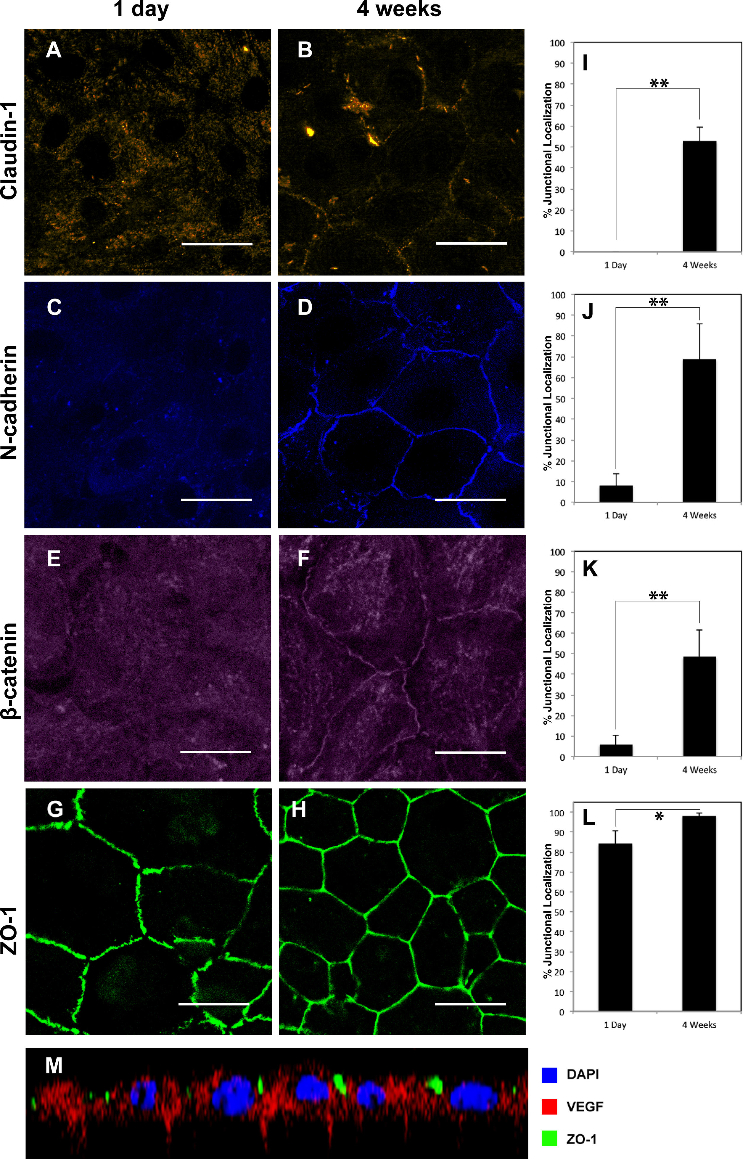4 weeks after reaching confluency. All junctional proteins, except for ZO-1, had limited localization after 1 day post confluence.