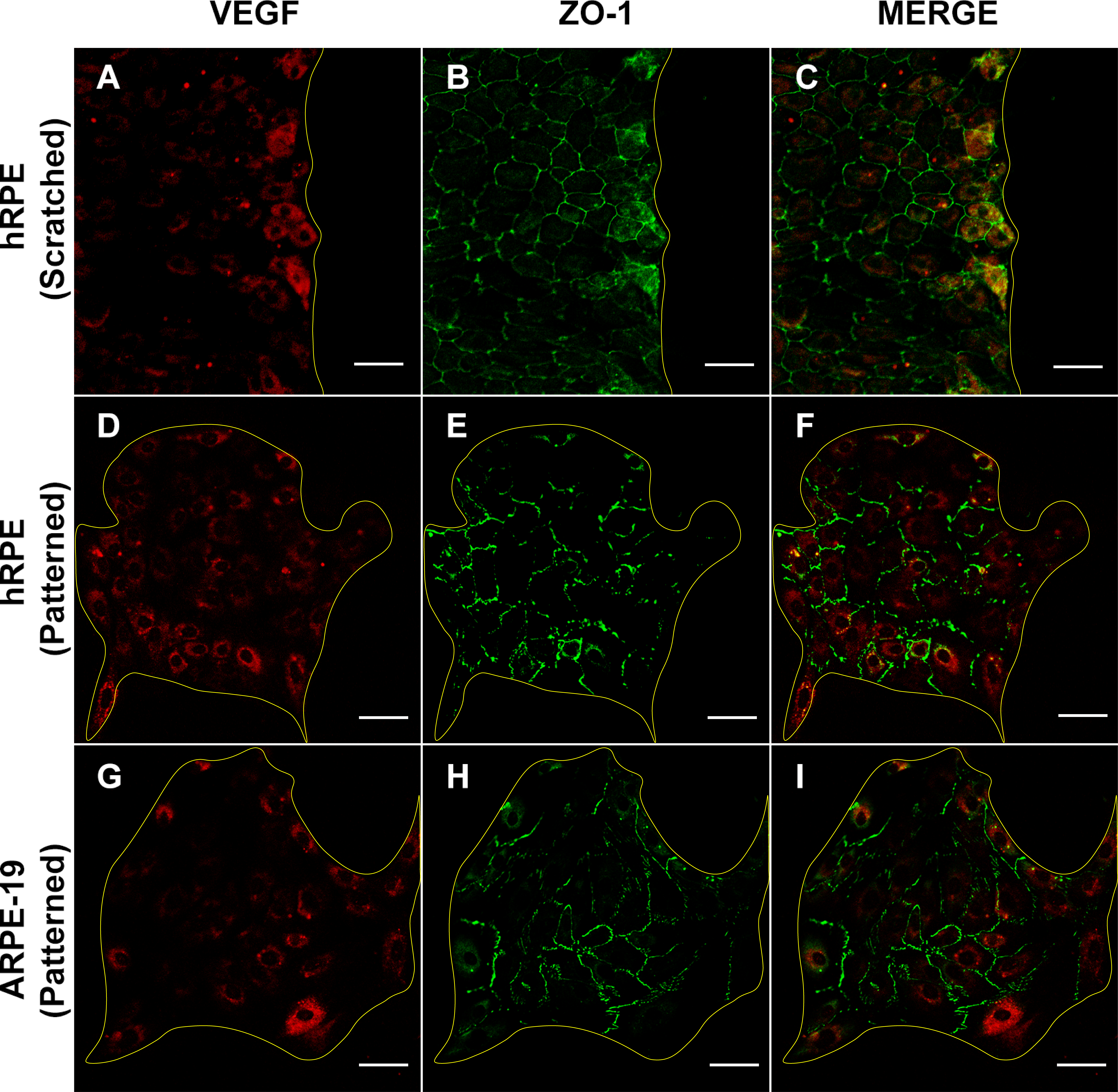 (4 weeks after confluency) 24 h after scratching (A-C) and micropatterned hRPE (D-F) and ARPE-19 cells (G-I) 24 hours after removing PDMS stencils. VEGF expression increased in cells proximal to the scratched area (A) and along the periphery of the micropatterns (D, G). This increase in VEGF expression correlated with dislocalization of ZO-1 from intercellular zones to the cytoplasm in both