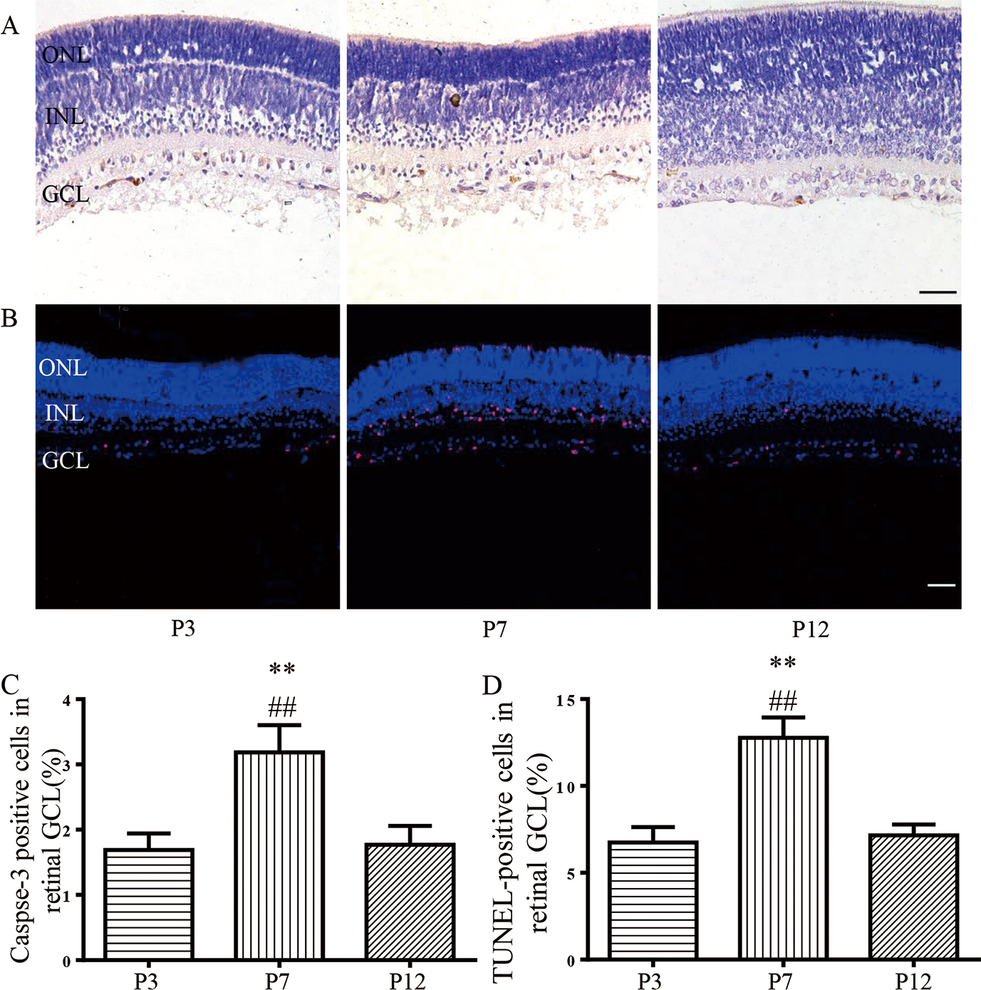 deoxynucleotidyl transferase dUTP nick end labeling (TUNEL) assay (TUNEL-positive; n = 5 retinas per group). A: Representative photomicrograph of caspase-3-positive cells (brown) in the rat retinal GCL. Scale bar = 50 μm. B: Respective photomicrograph of TUNEL-positive cells (red) in the rat retinal GCL. Scale bar = 25 μm. C: The mean percentages of caspase-3 positive cells at P3, P7, and P12. D: The percentages of TUNEL-positive cells in the retinal GCL. #p<0.05, ##p<0.01 versus P3, #p<0.05, ##p<0.01 versus P12. One-way