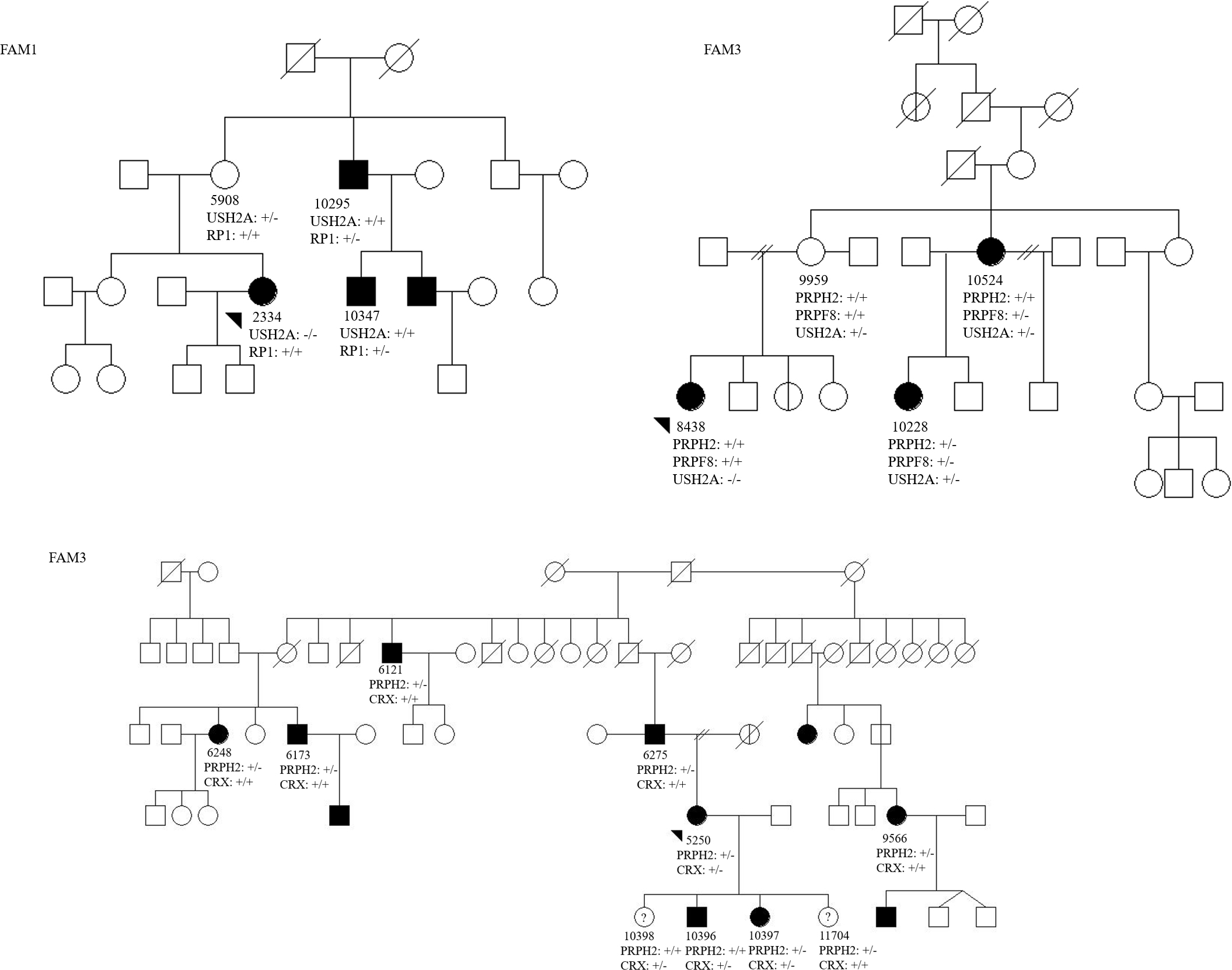 (FAM1, FAM2) and dominant pedigree (FAM3). Filled symbols indicate diagnosis of RP. Individuals for whom DNA samples were