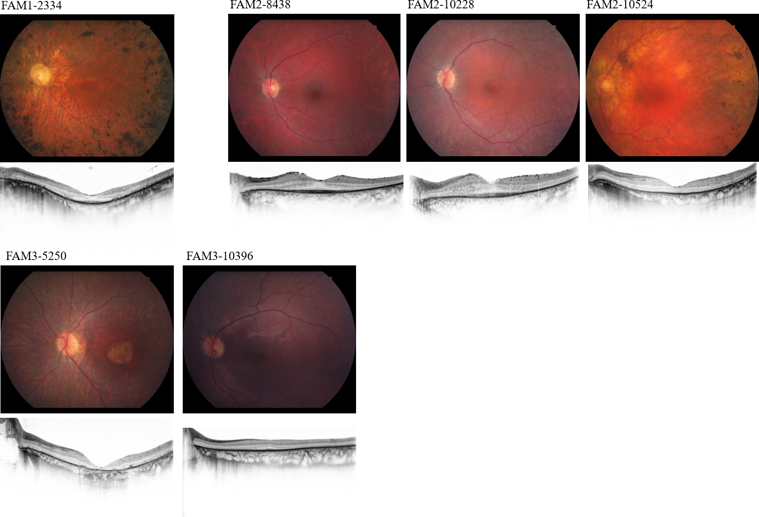 Fundus and SD-OCT images from individuals in three families diagnosed with inherited retinal disease. Representative central views of the left eye and the corresponding spectral domain optical coherence tomography (SD-OCT) image are shown.
