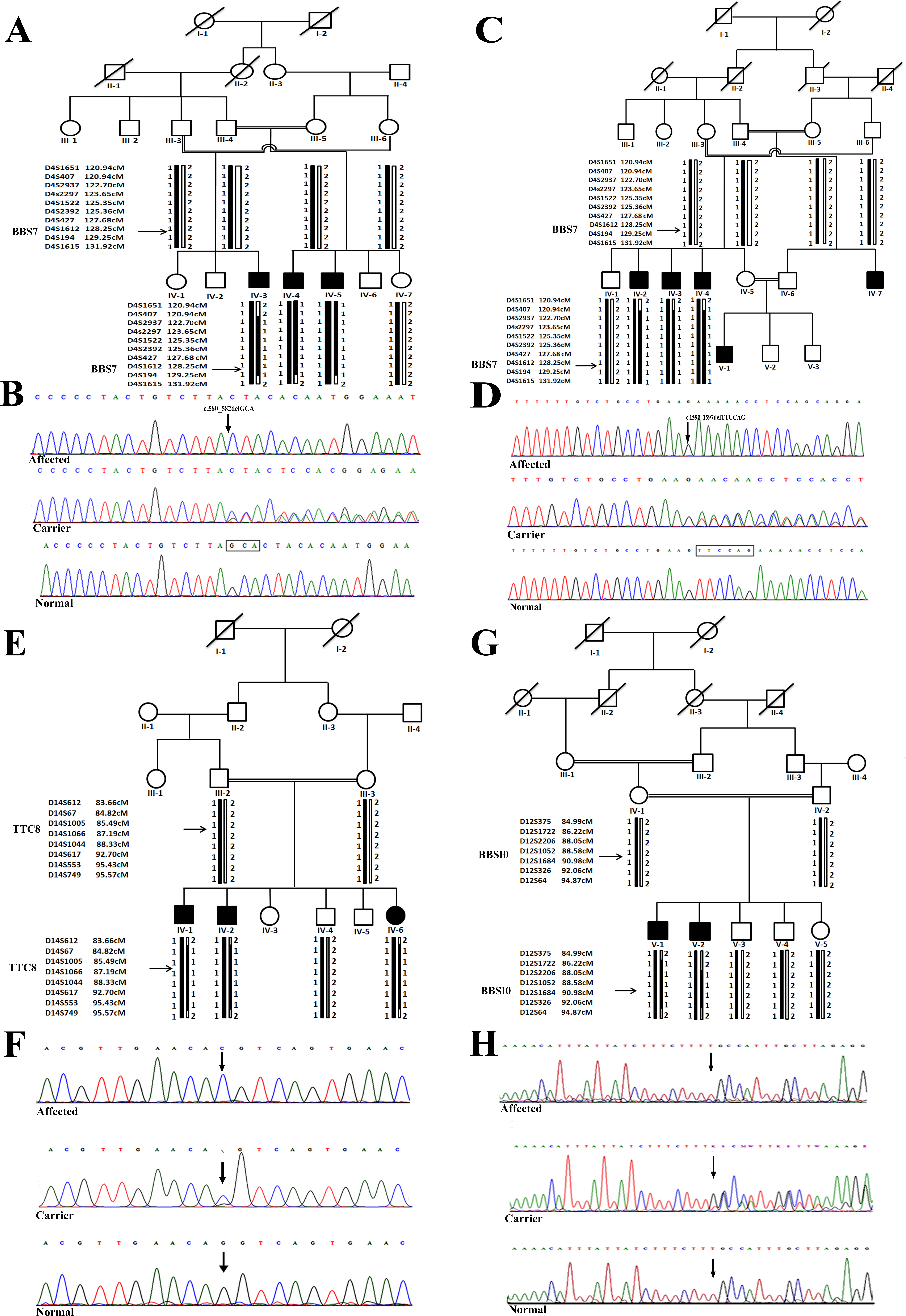 Figure 1. Pedigrees and Sanger sequencing results for four families segregating BBS in an autosomal recessive pattern. A: Pedigree of family A. B: Sequence analysis of the BBS7 gene showing a 3 bp deletion at nucleotide position 580–582 (c.580_582delGCA). C: Pedigree of family B. D: Sequence chromatograms of 6 bp deleted variant (c.1592_1597delTTCCAG) in the BBS7 gene. E: Pedigree of family C. F: Sequence analysis of the variant (c.1347G>C) identified in the gene BBS8 in family C. G: Pedigree of family D. H: Sequence chromatogram of the frameshift mutation (c.271_272insT) found in the BBS10 gene in family D. The genotype of individuals for the mutation identified in the respective family, verified with segregation