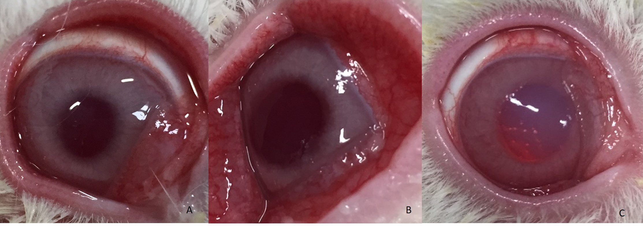 Figure 1. Colour photograph of rabbits’eye. Twenty-four hours after surgery, eyes of the PBS group A, the 0.2% genipin crosslinking (GP-CXL) group B, and the ultraviolet A (UVA)-riboflavin crosslinking (UVA-CXL) group C showed eyelid swelling, conjunctival congestion, and corneal edema.