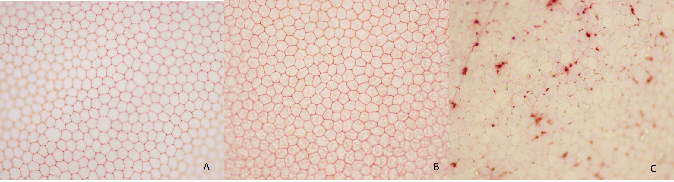 Figure 3. Alizarin red and trypan blue staining of the endothelium after surgery. A: The cells are seen as complete endothelial cells in the PBS group. B: The endothelial cell borders in the 0.2% GP-CXL group are clear. C: In the UVA-CXL group, many apoptotic cells are present.