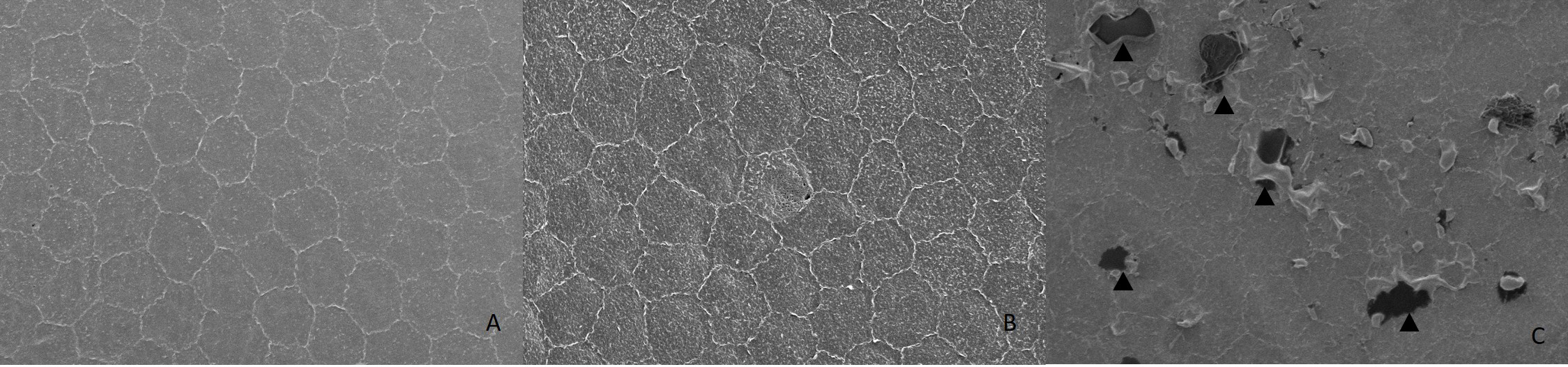 Figure 4. Representative SEM images of endothelial cells after surgery (1,000X). A: Endothelial cells in the PBS group appear the same as endothelial cells in the 0.2% GP-CXL group. B: In the GP-CXL group, solitary cell damage can be seen, with the remaining endothelial cells maintaining a hexagonal structure.