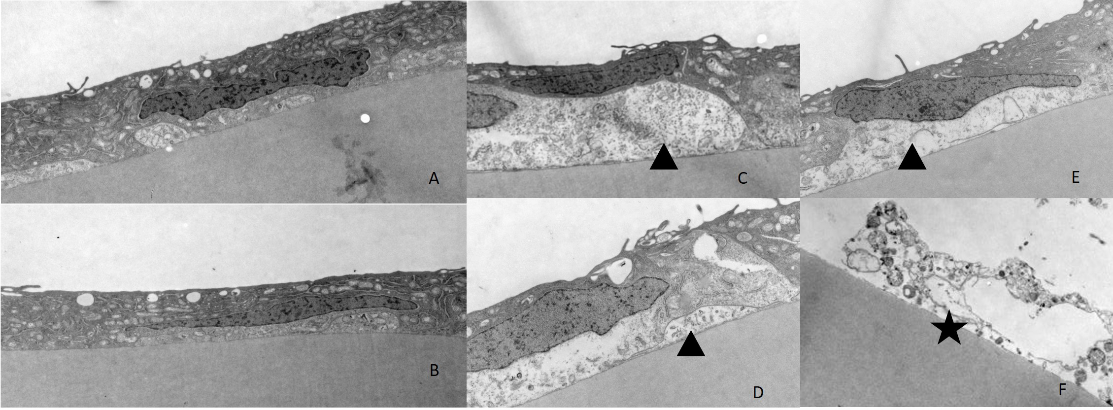 F: Some broken endothelial cells have lost their normal hexagonal structures (black star).