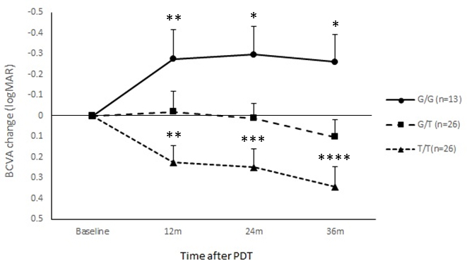 ARMS2 on the chronological change in the BCVA (logMAR) in patients with wet AMD treated with PDT. All values are presented as means