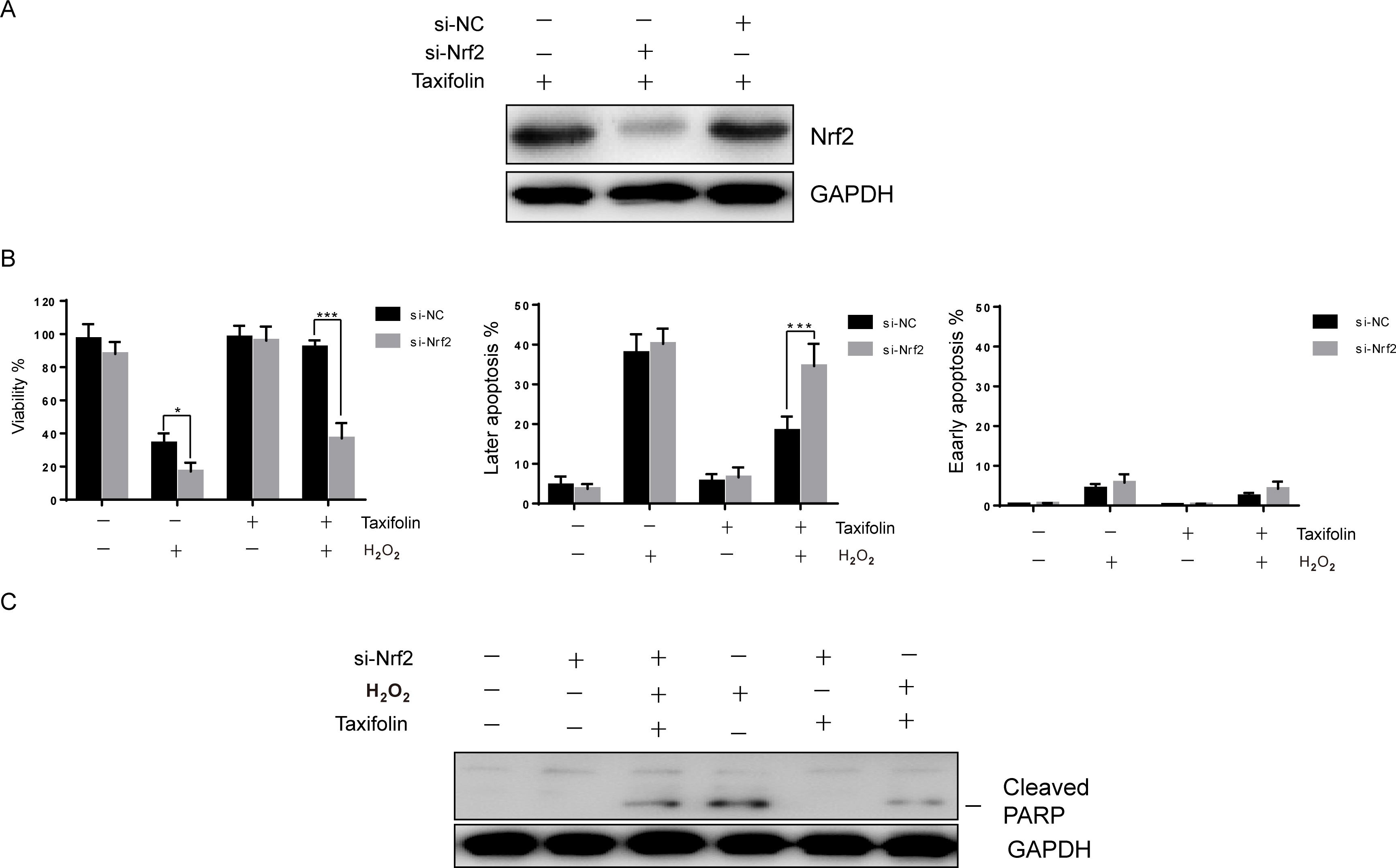 Figure 5. Nrf2 mediates taxifolin-induced cytoprotective effect against H2O2 in ARPE-19 cells. A: RPE cells transfected with si-Nrf2 or with si-NC in the presence of taxifolin. Western blot analysis was performed to measure