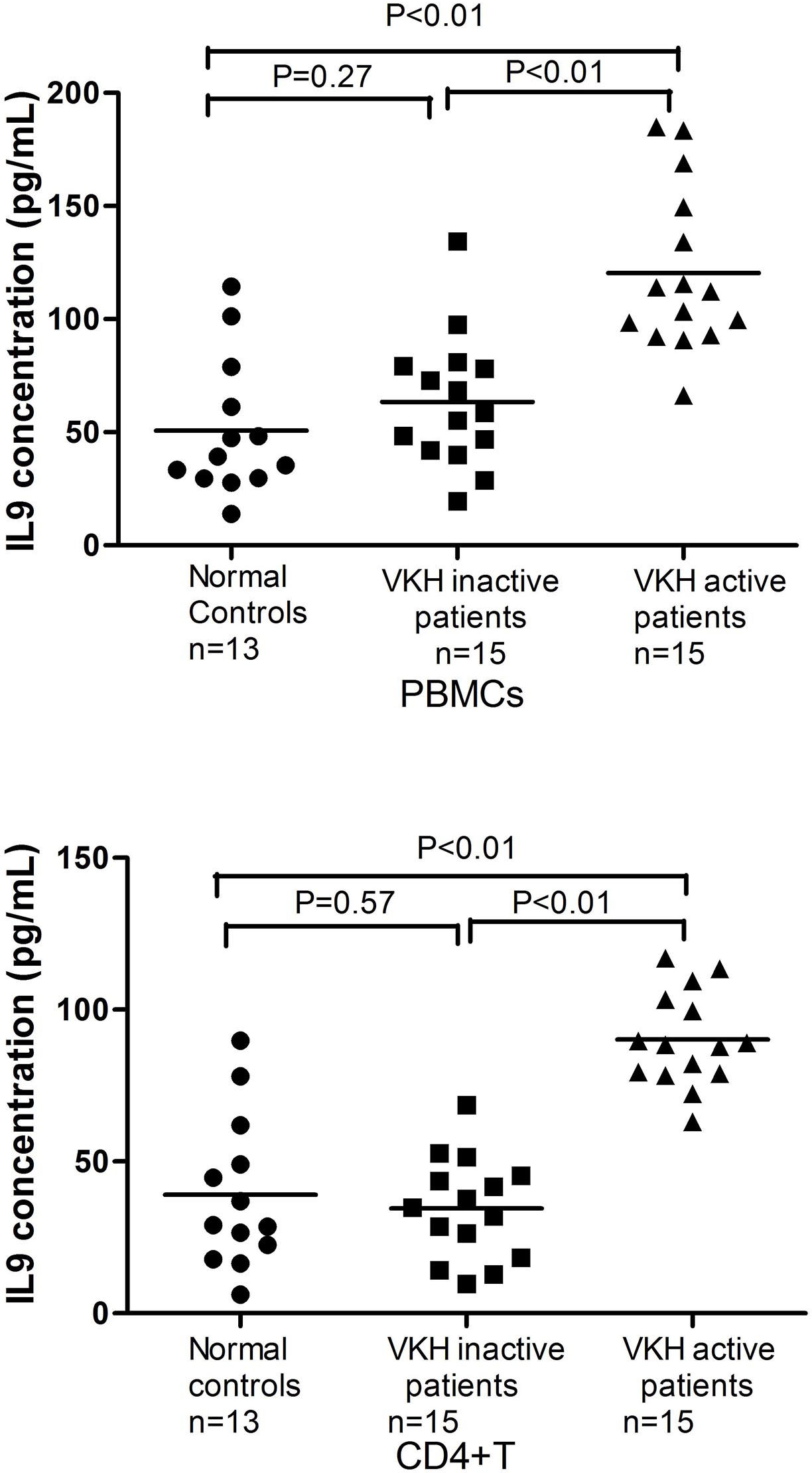 Figure 2. Production of IL-9 in VKH disease. Production of IL-9 by peripheral blood mononuclear cells and CD4+ T cells from normal controls