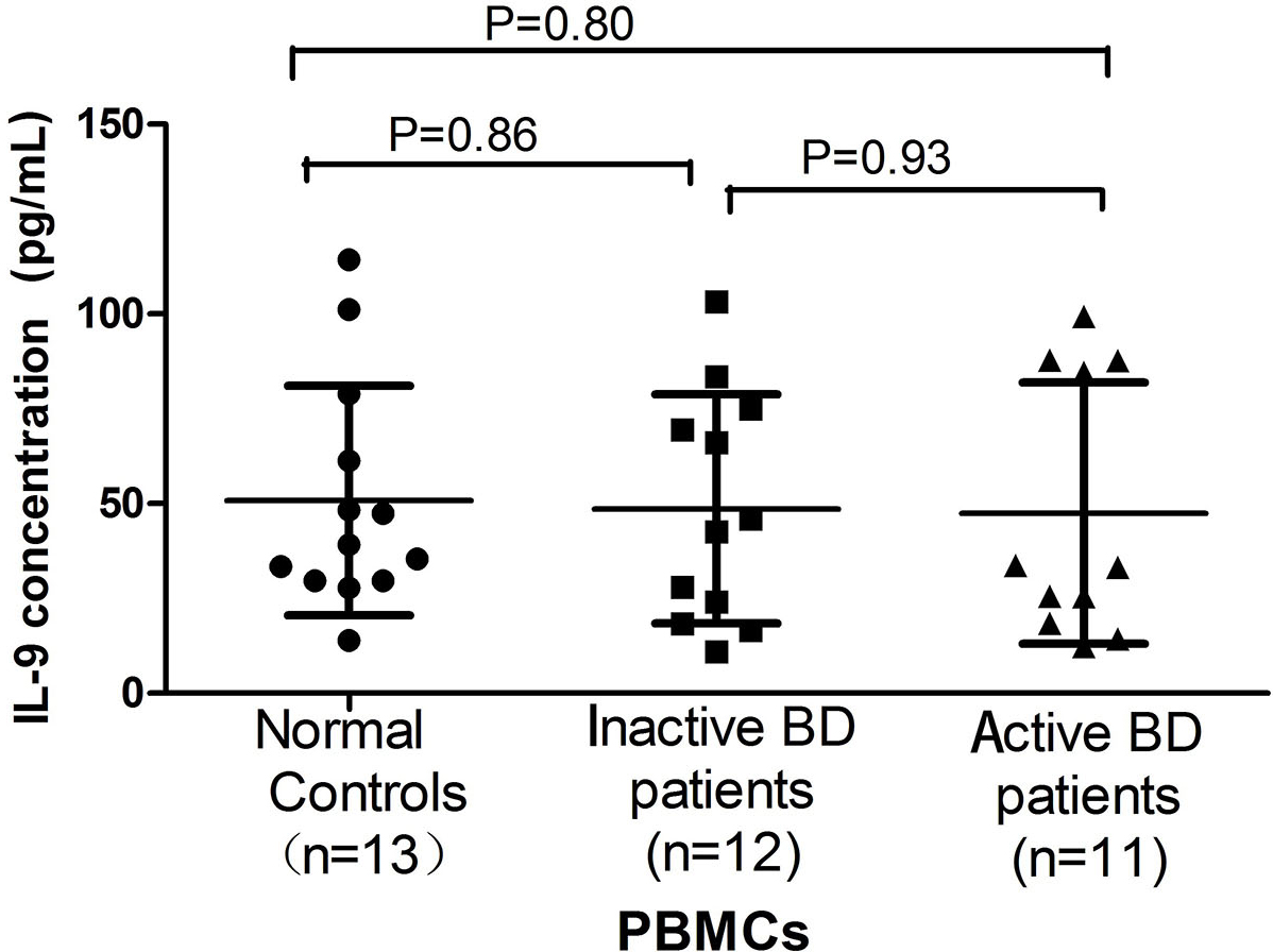 Figure 6. Production of IL-9 in BD. The production of IL-9 by peripheral blood mononuclear cells from normal controls (n = 13), patients