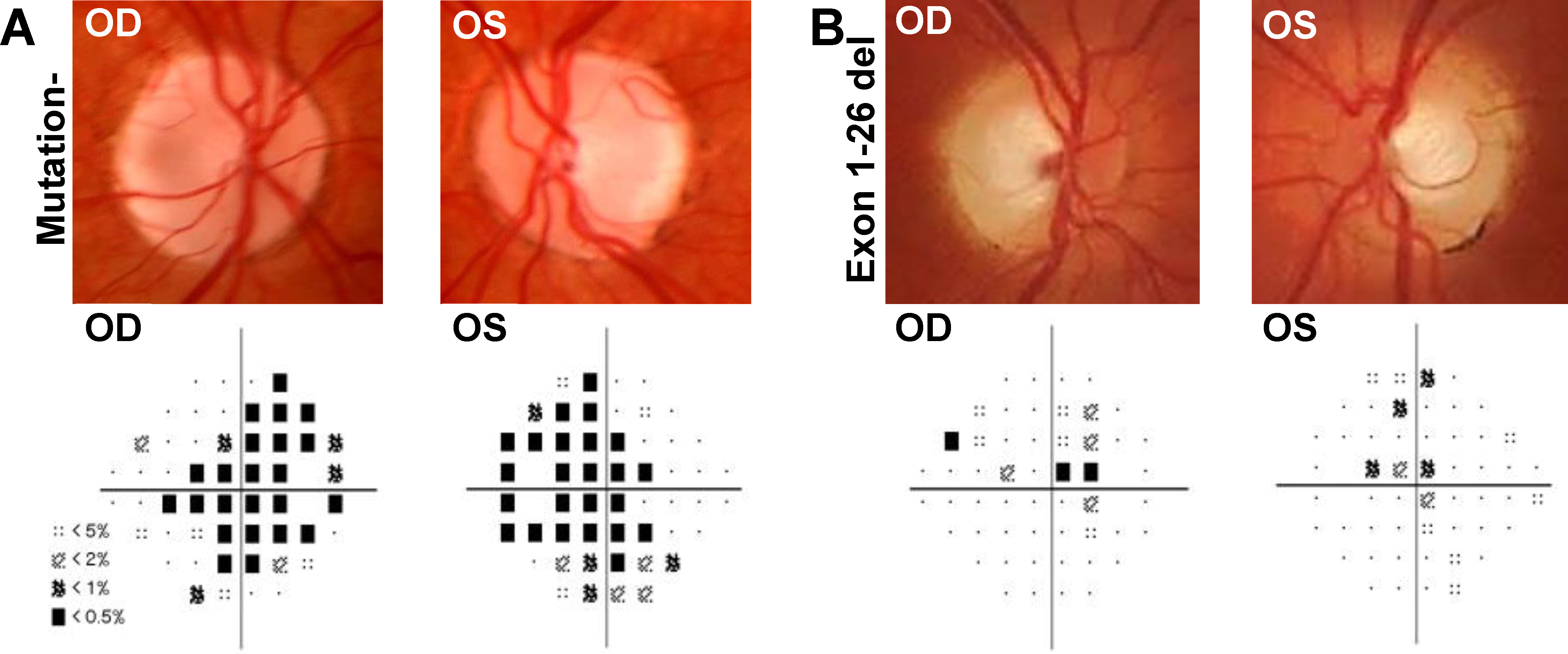 field (HVF) pattern standard plots (bottom) in two patients with optic atrophy: one without an OPA1 variant (or other known gene; A), and one with a deletion extending from exon 1 to 28 (B). The HVF pattern standard plots show bilateral central/paracentral, temporal, and inferior Bjerrum defects for the mutation