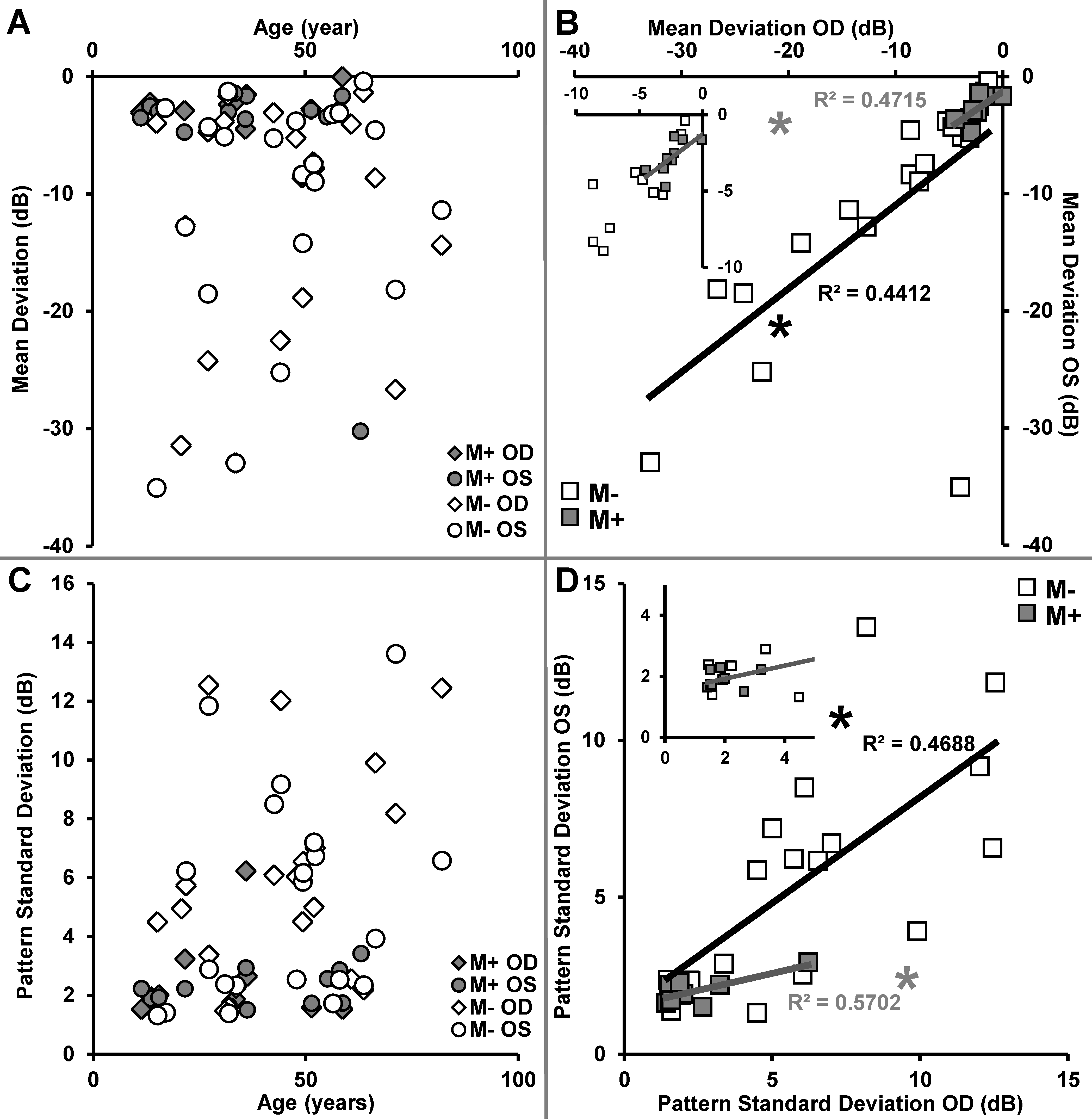 Figure 3. HVF parameters in patients with and without mutations in OPA1. A, B: Humphrey visual field (HVF) mean deviation values averaged oculus uterque (OU) as a function of age (A) and plotted oculus dexter (OD) and oculus sinister (OS) on the X- and Y-axes, respectively (B). C, D: HVF pattern standard deviation values averaged OU as a function of age (C) and plotted OD and OS on the X- and Y-axes, respectively (D).