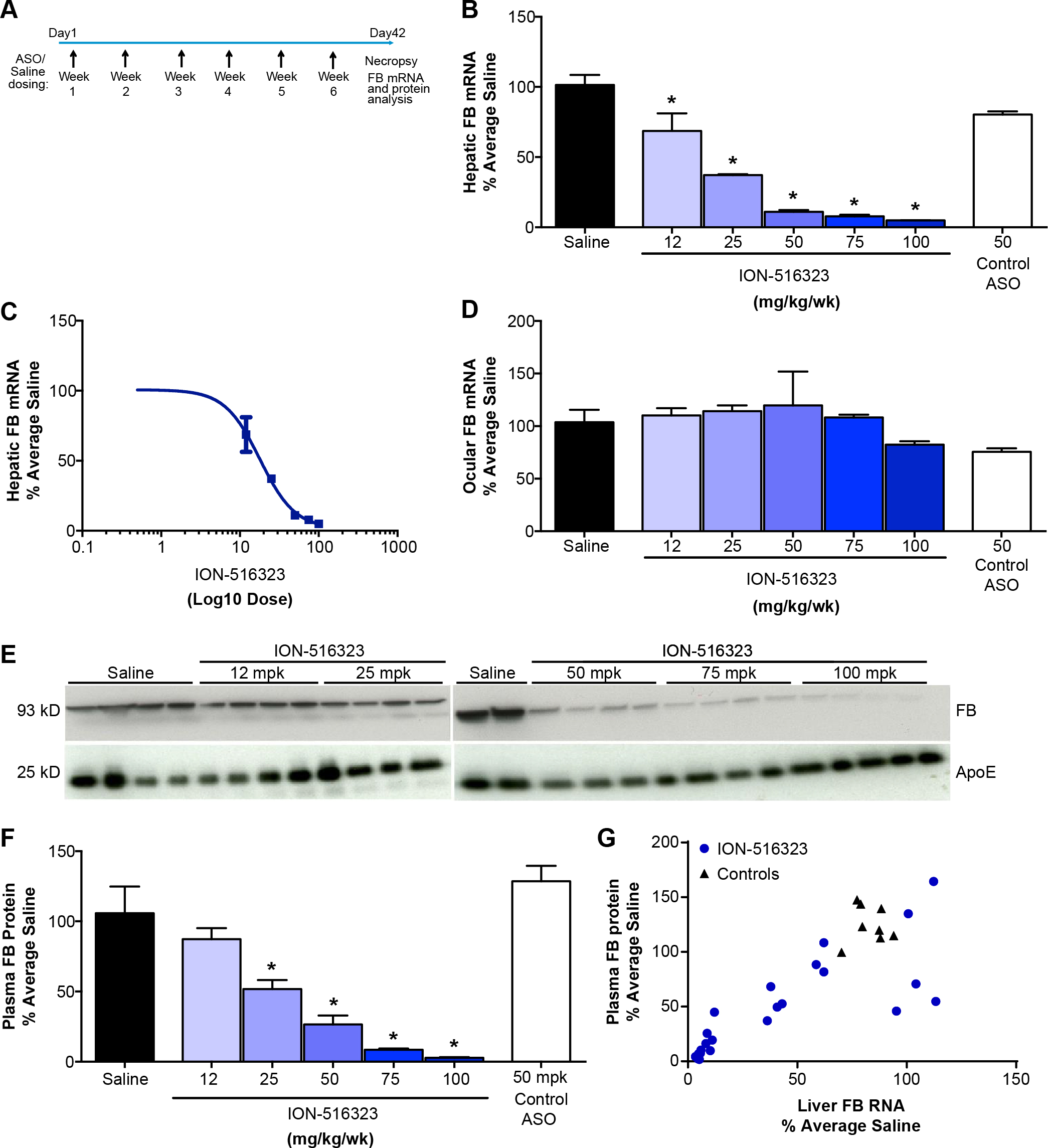 group). A: Study design. B: Dose-dependent reduction in hepatic factor B mRNA after subcutaneous administration of factor B ASO. C: ED50 of hepatic factor B mRNA reduction by mouse factor B ASO. D: Ocular factor B mRNA level. E: Dose-dependent reduction in plasma factor B protein levels after the administration of the factor B ASO. F: Factor B protein level was measured with western blot with anti-factor B antibody. Quantification of the western blot using