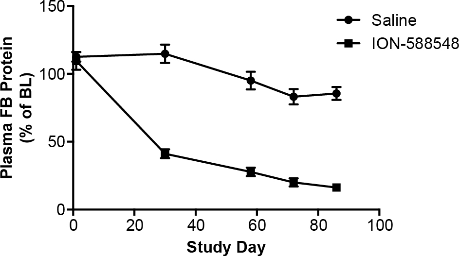 were dosed with saline (n = 6) or ION-588548 (n = 4) at 40 mg/kg/wk for 13 weeks. Plasma samples were obtained at days −6,