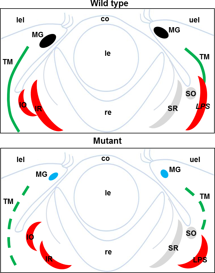 TM = tarsal muscle, LPS = levator palpebrae superioris, IO = inferior oblique, IR = inferior rectus, SR = superior rectus,