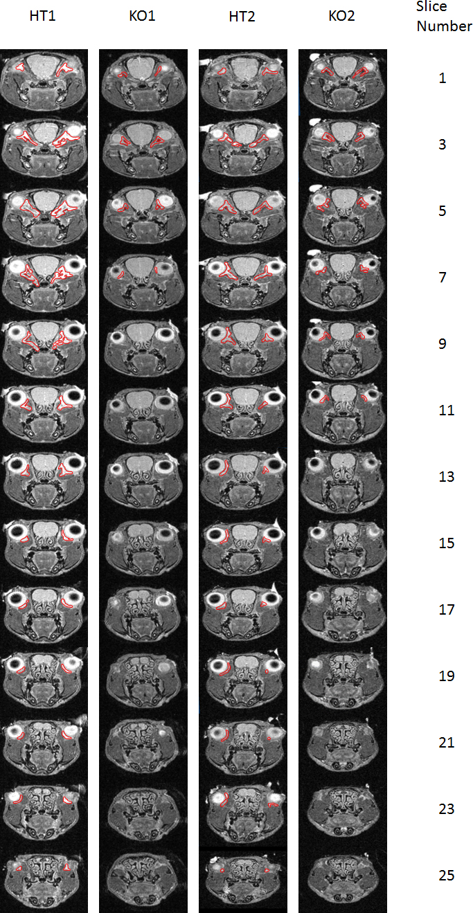 Figure 2. Comparisons of extraocular muscles among KO and HT mice. Selected coronal image slices for four mice: two KO (knockout) and