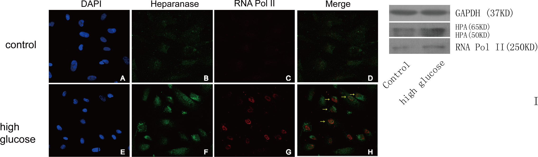 and RNA Pol II (H, arrows). Western blot analysis indicated that the expressions of heparanase and RNA Pol II were higher in the high-glucose