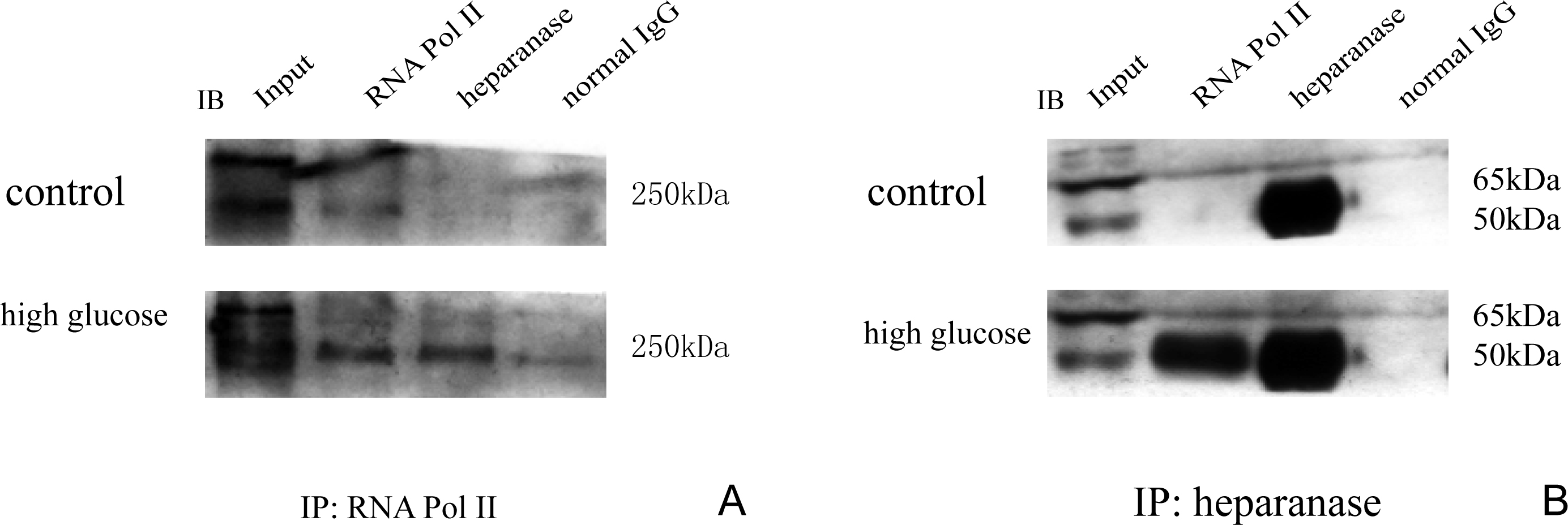 The second lane in A and the third lane in B both meet heparanase bound with RNA Pol II together in high glucose HRECs. All experiments were performed in triplicate.