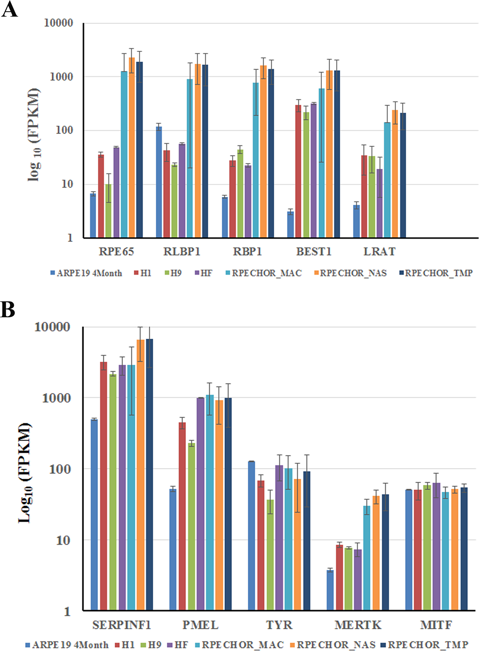 and macular (RPE/CHOR_MAC) regions of the RPE/choroid were used for the analysis. A: Comparison of the expression of the visual cycle genes. B: Comparison of the expression of RPE-specific genes. The x-axis indicates the expression levels of the genes analyzed. The
