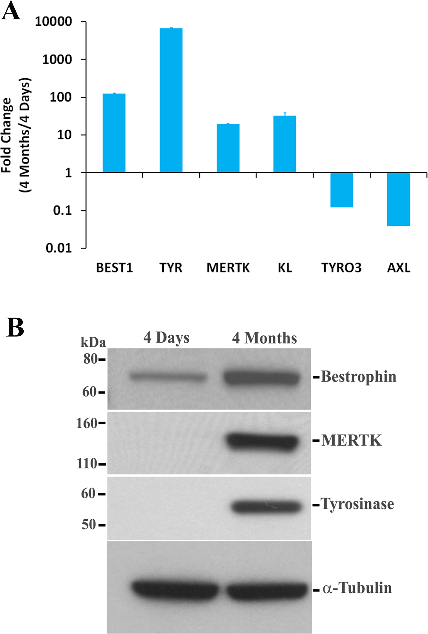 Figure 6. Differentiation of RPE cells increases non-visual cycle gene expression. ARPE-19 cells grown for either 4 days or 4 months