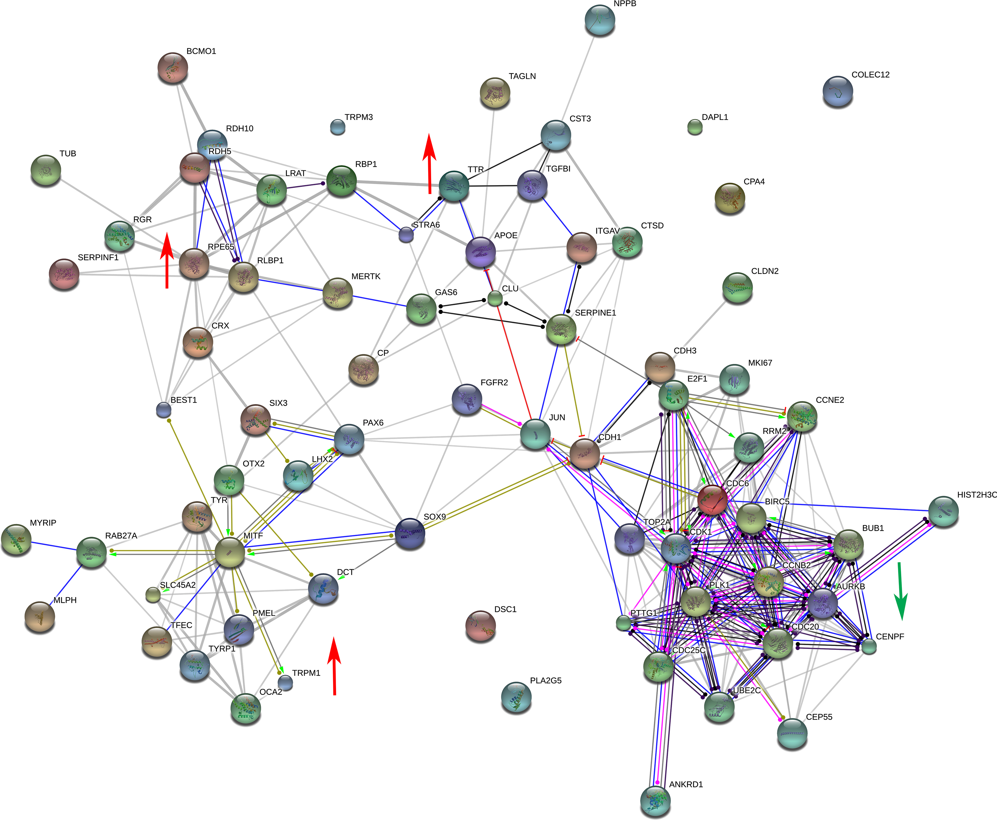 Figure 9. Protein network visualization of genes differentially expressed in the differentiated RPE cells. Significantly altered up-