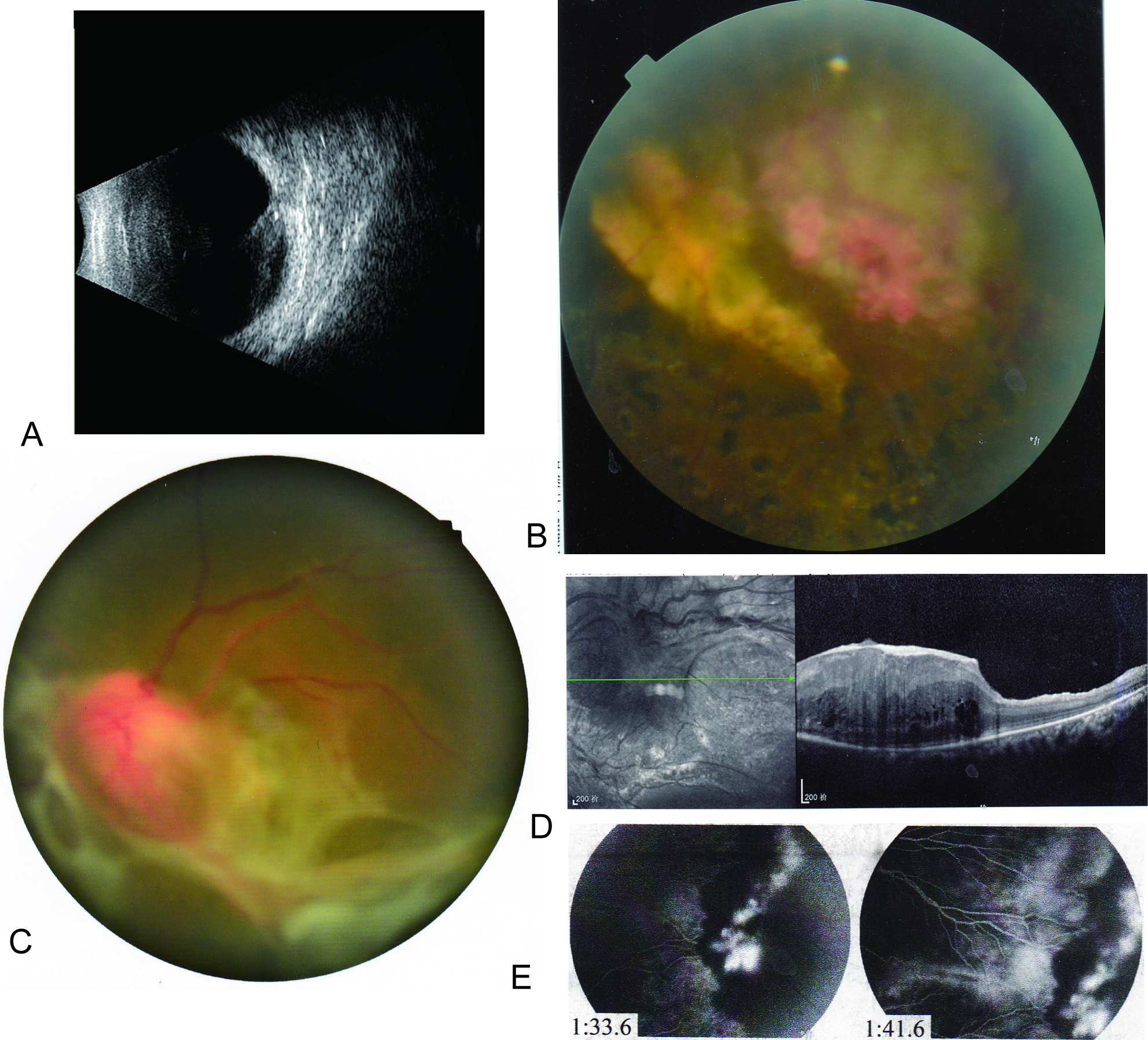 Figure 2. Clinical examinations of patients with severe FEVR. A: B-scan ultrasonographic of the proband in family A reveals an irregular peripheral wall of the eyeball and persistent fetal