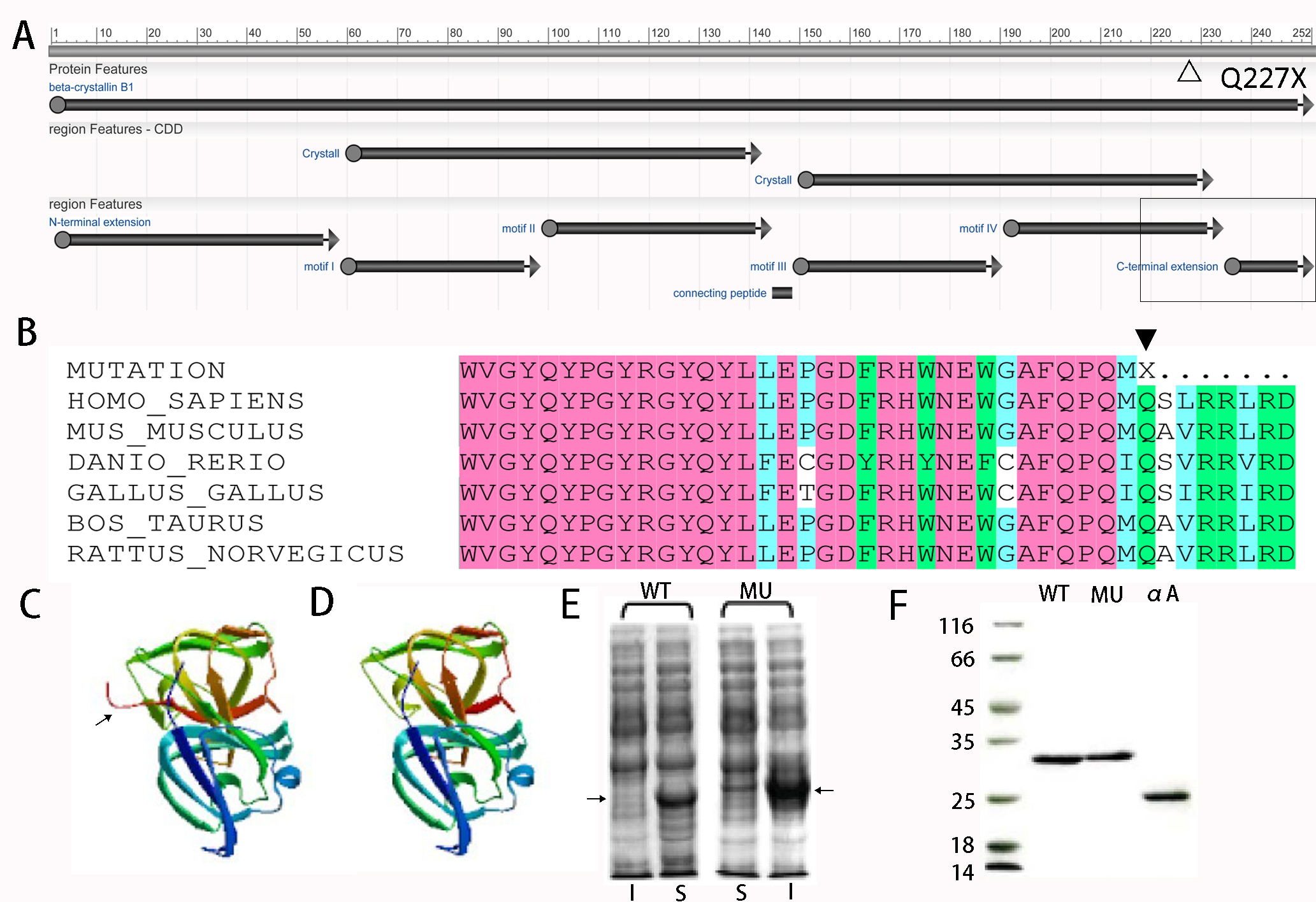 Figure 2. Comparison between the structure and solubility of WT and MU-βB1 proteins. A: Diagrammatic sketch of βB1 protein features. The hollow triangle indicates the position of p.Q227X; the hollow rectangle