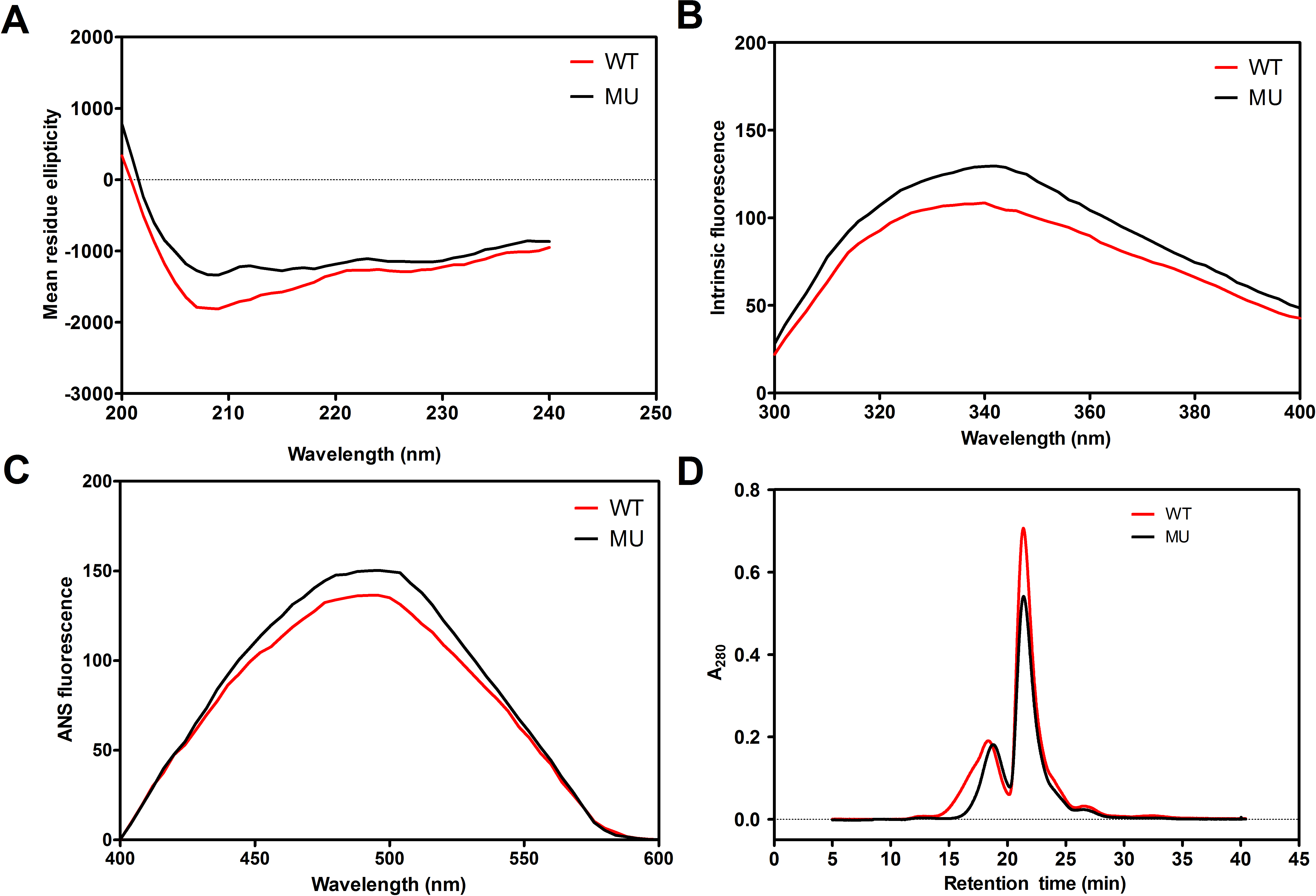Figure 3. Biophysical characterization of the effect of the mutation in p.Q227X on the structures of βB1-crystallin. A: Far-ultraviolet (UV) circular dichroism (CD) spectra of the wild-type (WT) βB1 protein and its mutant protein. The spectra