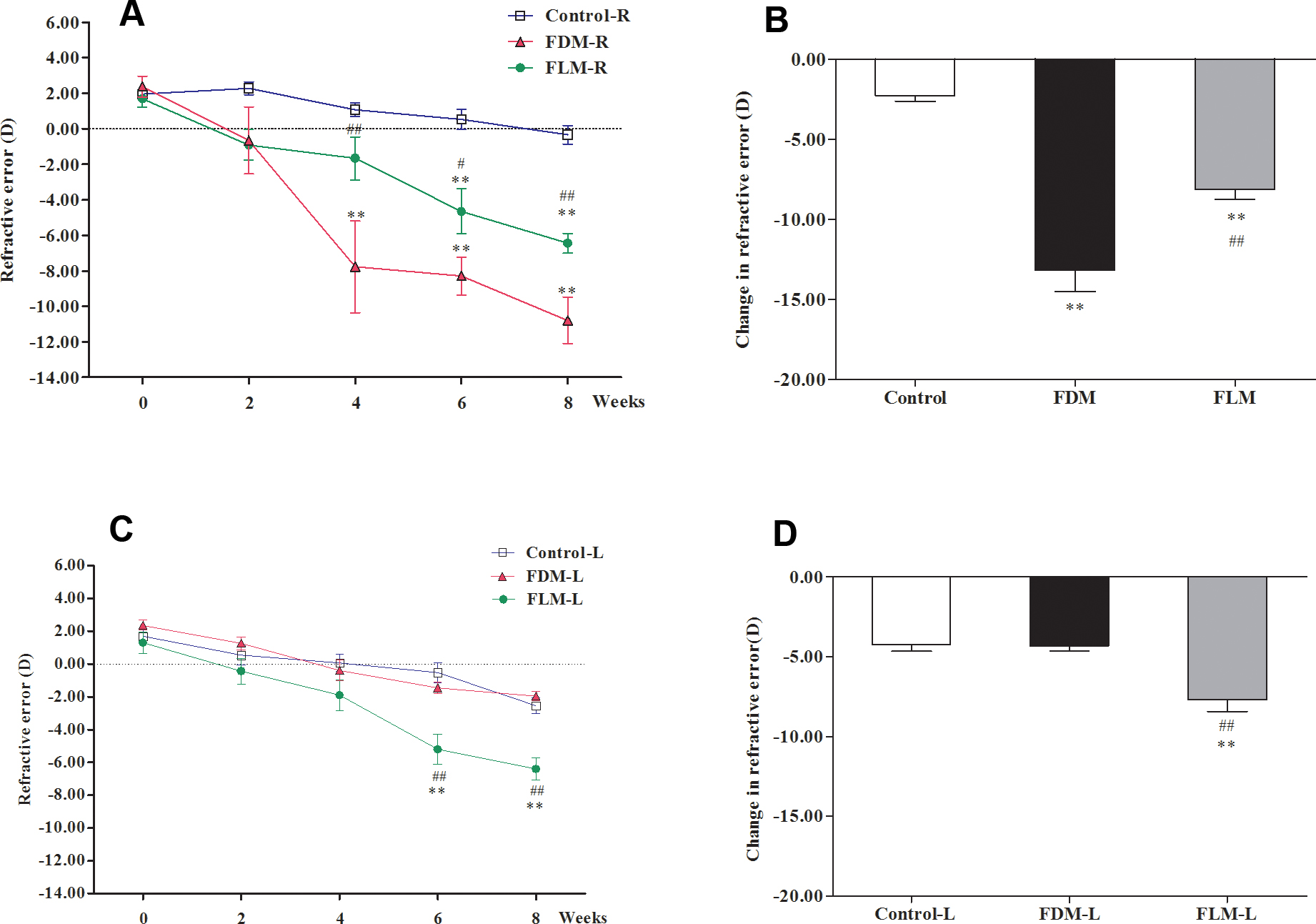 Figure 1. Refractive comparisons in bilateral eyes of the control, FLM, and FDM groups during the 8-week treatment period. A: Refraction of the right eyes in the three groups throughout the experiment. B: Refractive changes of the right eyes in the three groups after 8 weeks of treatment. C: Refraction of the left eyes in the three groups throughout the experiment. D: Refractive changes of the left eyes in the three groups after 8 weeks of treatment. The calculation of change was based