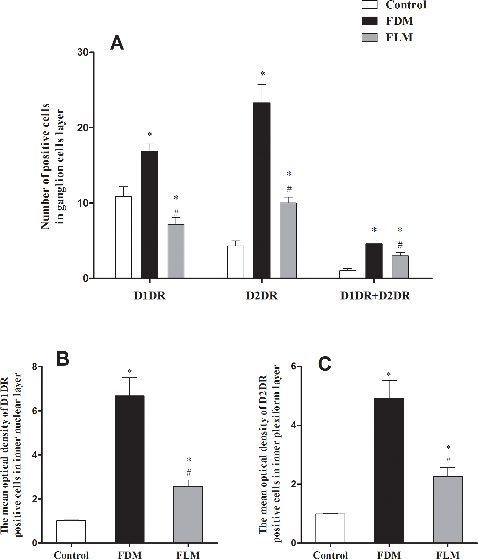 the INLs and IPLs, the quantities of D1DR and D2DR increased in both the FDM and FLM groups (FLM: flickering light (FL)-induced