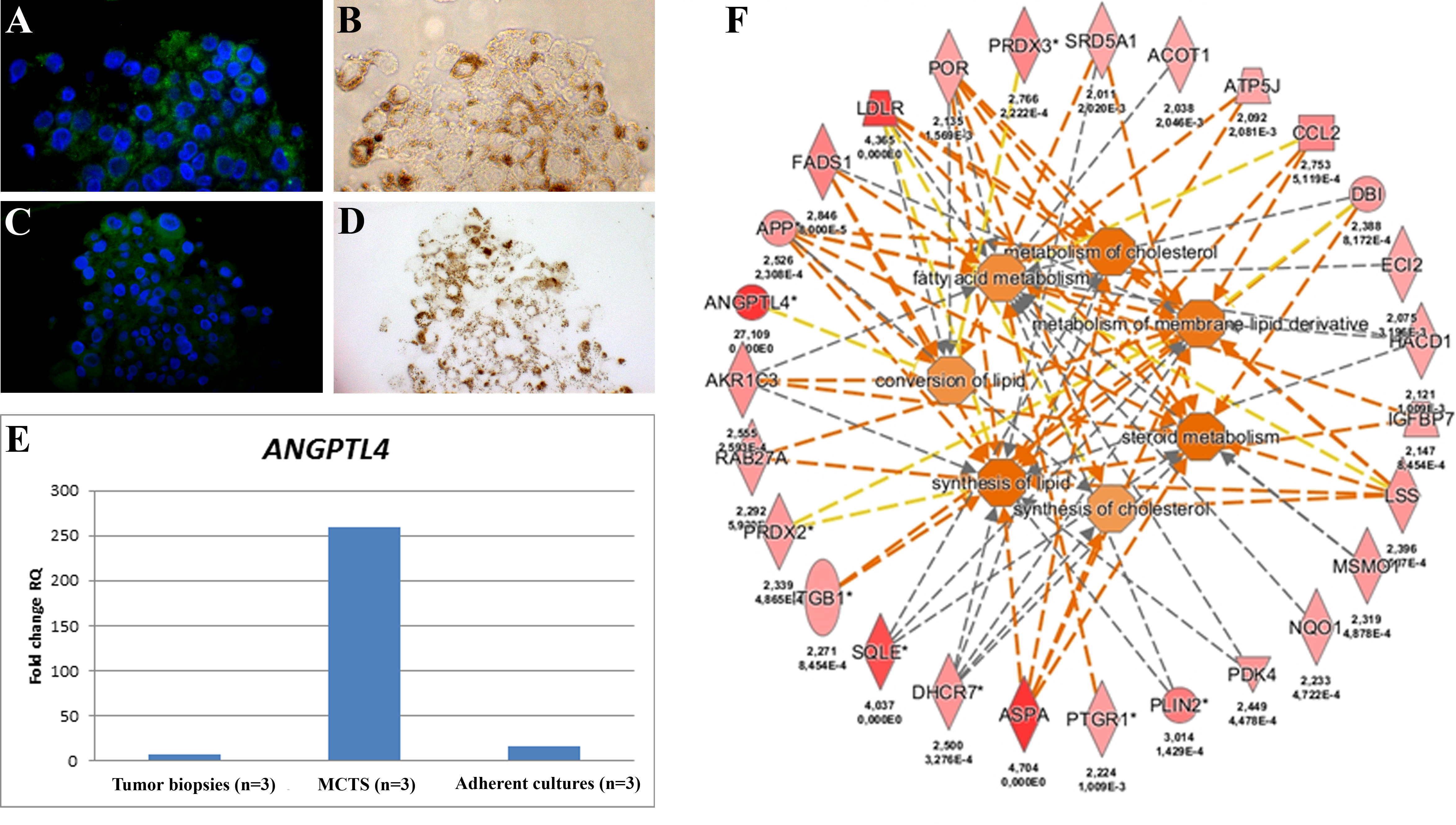 Figure 4. Lipogenic profile of uveal melanoma multicellular tumor spheroids. Angiopoietin like 4 (ANGPTL4; green) staining of multicellular tumor spheroids (MCTS), Hoechst staining of nucleus (blue; A) with corresponding light-microscopic image (B). Perilipin 2 (PLIN2) staining (green) of MCTS and Hoechst staining of the nucleus (blue; C) with the corresponding light microscopic image (D). E: Quantitative reverse-transcription PCR (qRT-PCR) of ANGPTL4 in support of the microarray finding. F: Ingenuity Pathway Analysis (IPA) based on rank product (q≤0.05) in MCTS versus the tumor, showing important molecules and
