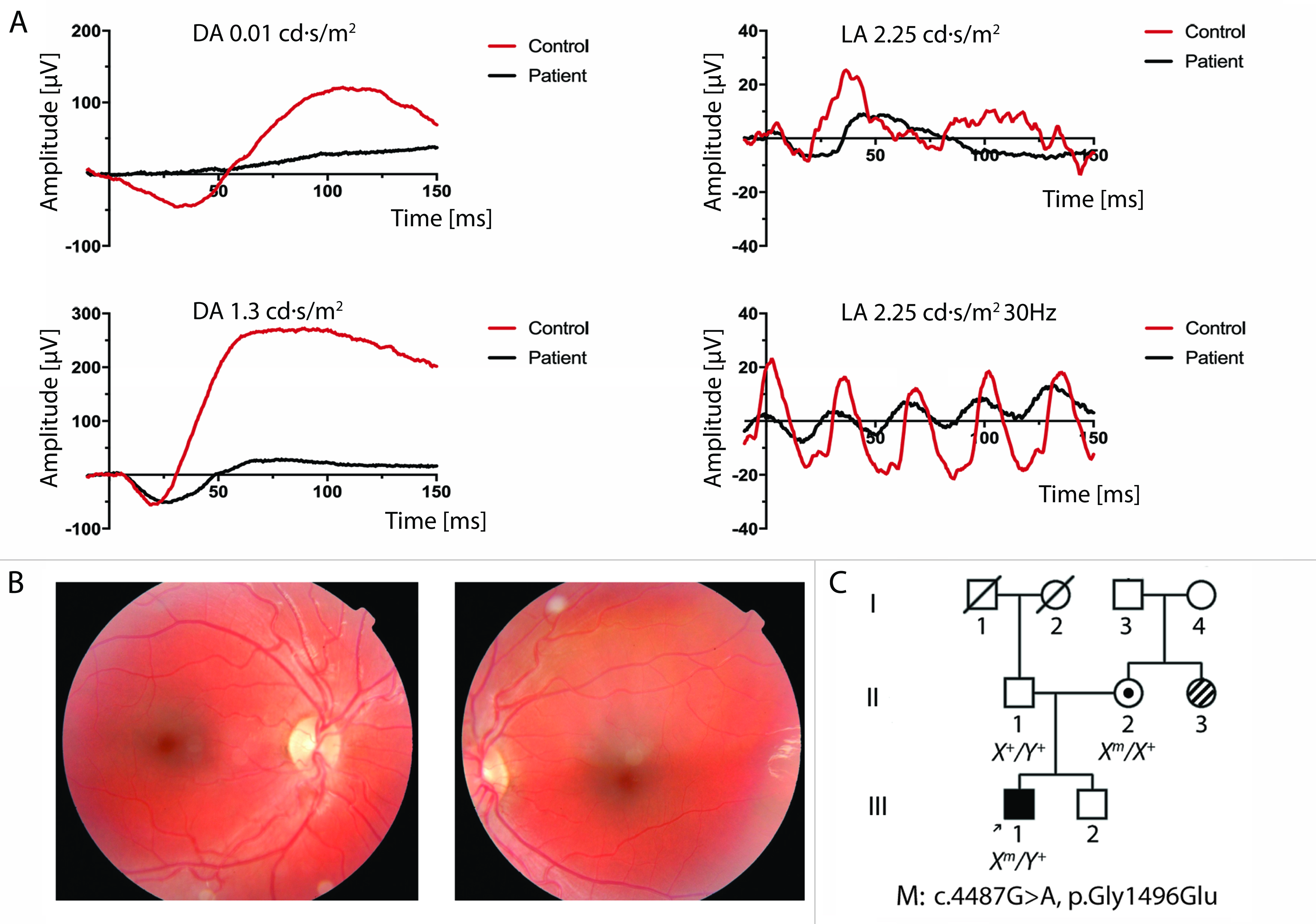 A: Electroretinograms (ERGs) recorded from Patient 2’s right eye at 5 months old (black traces). Scotopic and photopic responses