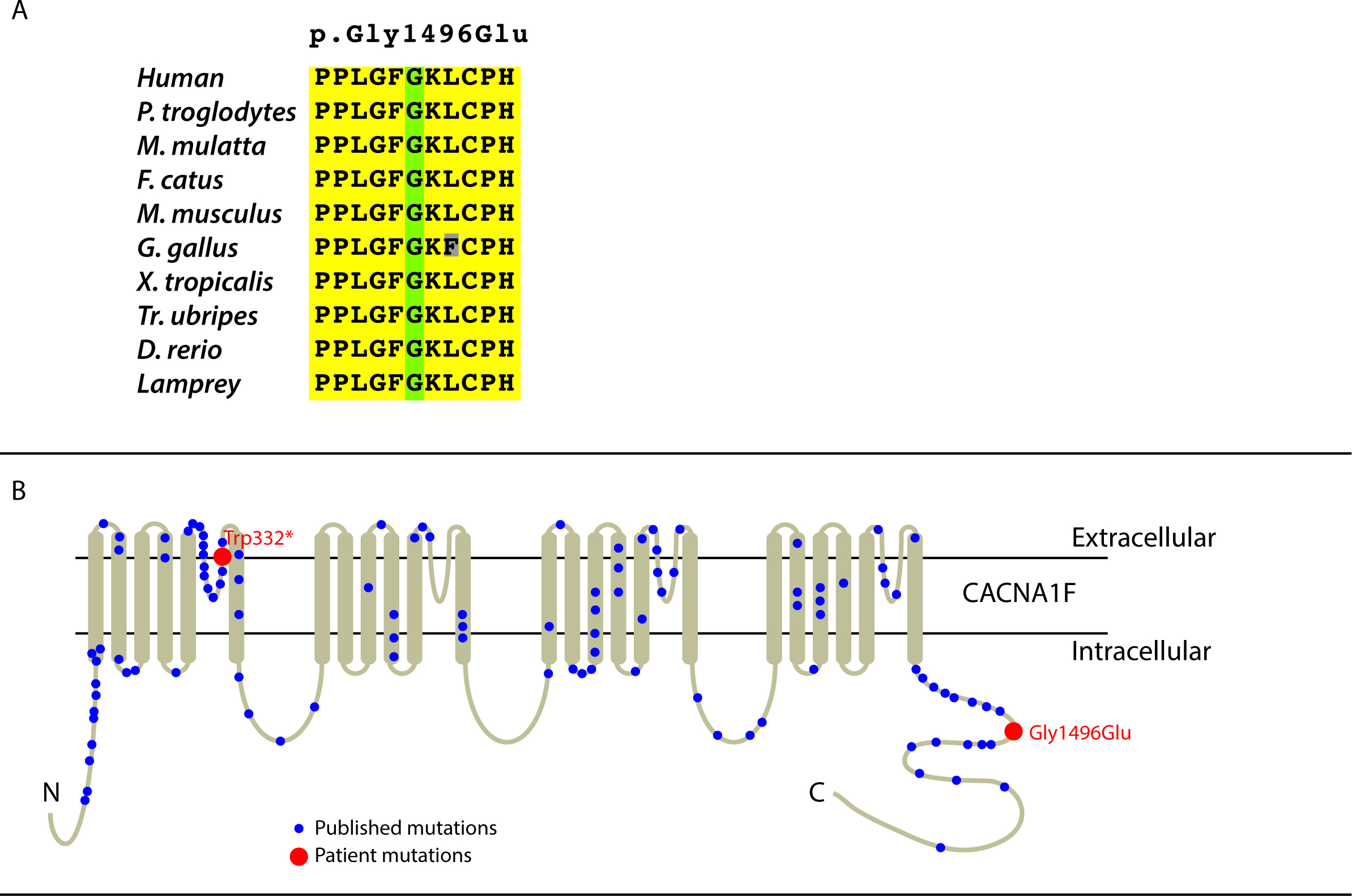 B: Schematic of the CACNA1F transmembrane protein and the positions of mutations p.(Trp332*) and p.(Gly1496Glu). (Adapted from