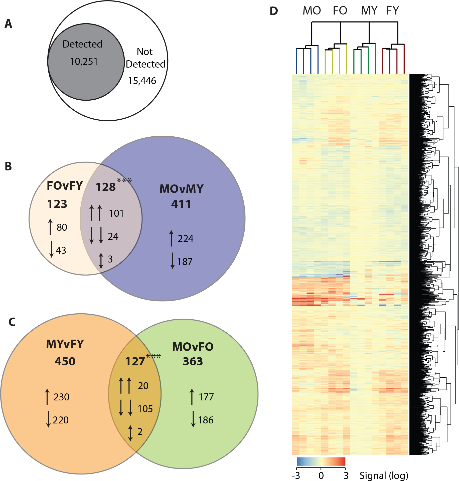 in respective groups (FO = female old, FY = female young, MO = male old, MY = male young). C: Sex differences in gene expression in young and old mice. D: Hierarchical clustering of all gene expression difference with age or between sexes. Samples segregated by sex and age.