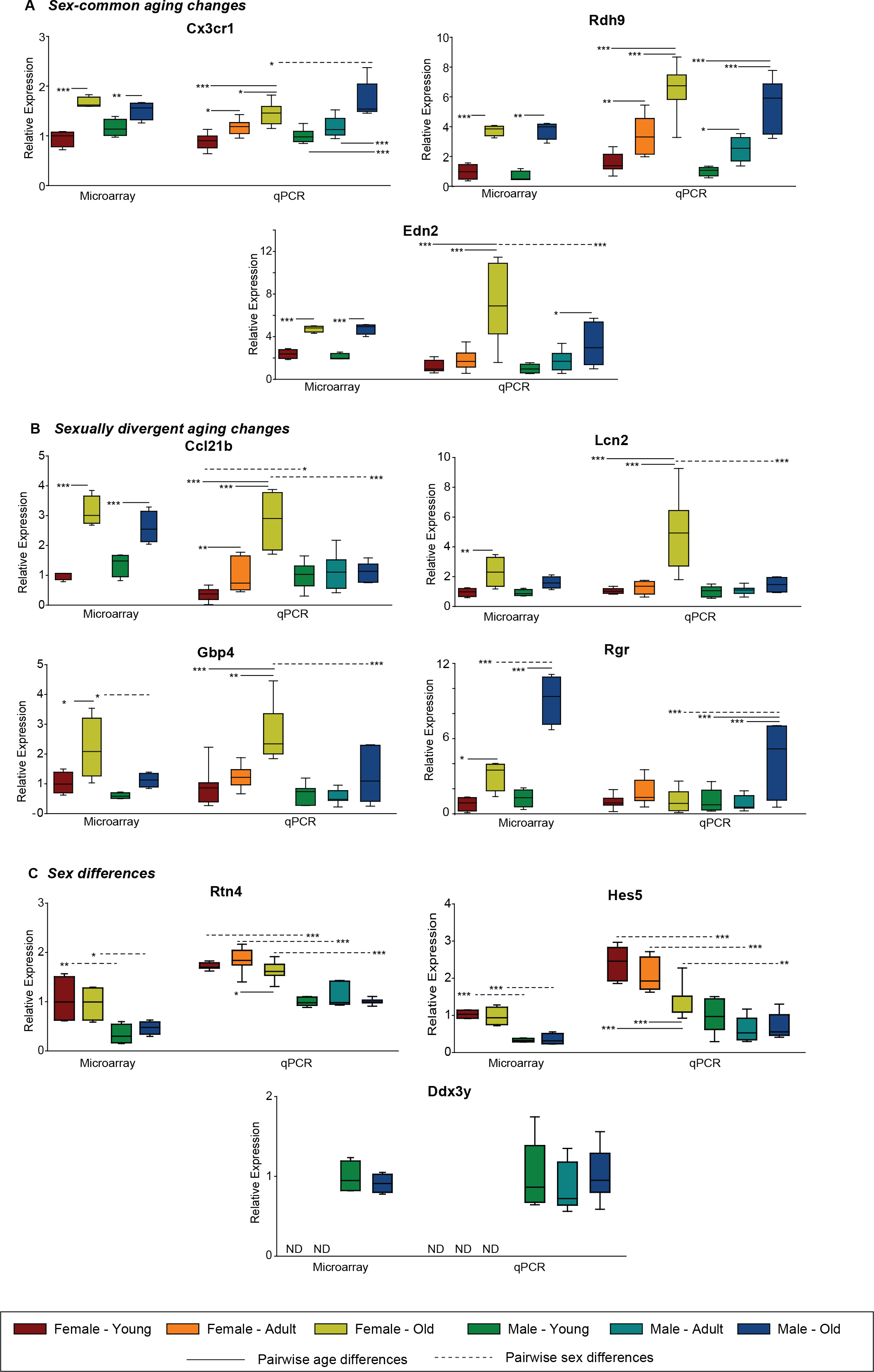 in female and male animals (A), sexually dimorphic aging changes (B), and changes related to sex differences (C). ND = not detectable. Data are shown as fold changes relative to young male animals for the microarray and qPCR data. Box