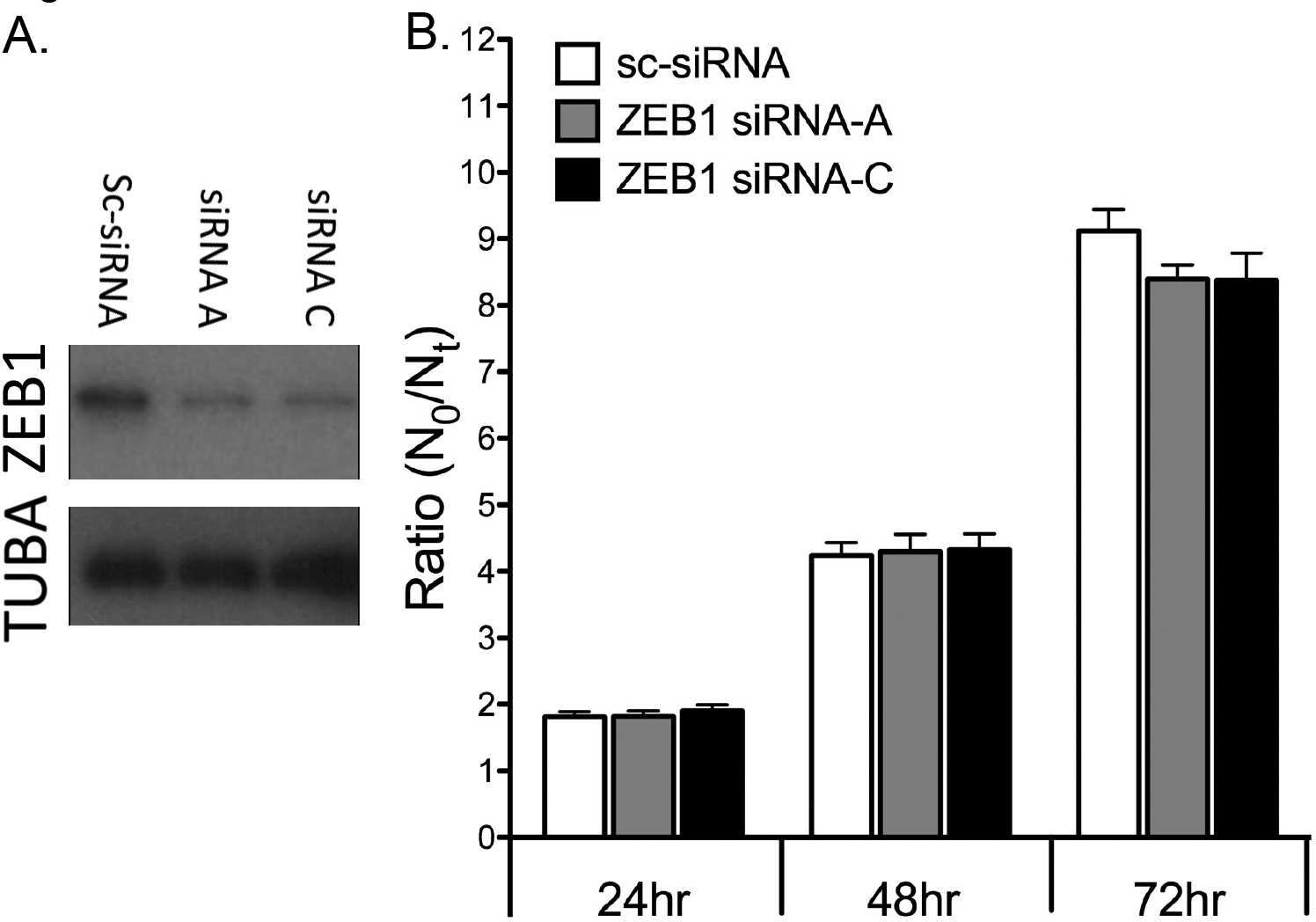 Figure 1. Cell proliferation in HCEnC-21T cells transfected with siRNA. Cells were transfected with scrambled siRNA (sc-siRNA), ZEB1 siRNA-A, or ZEB1 siRNA-C. A: ZEB1 knockdown was demonstrated by western blotting for ZEB1, with TUBA used as a loading control. B: Cell quantities at 24, 48, and 72 h (Nt) were compared to the initial quantity (N0), and plotted as the ratio Nt/N0. Results represent 12 independent data points (n=12). Error bars = standard error of the mean (SEM).