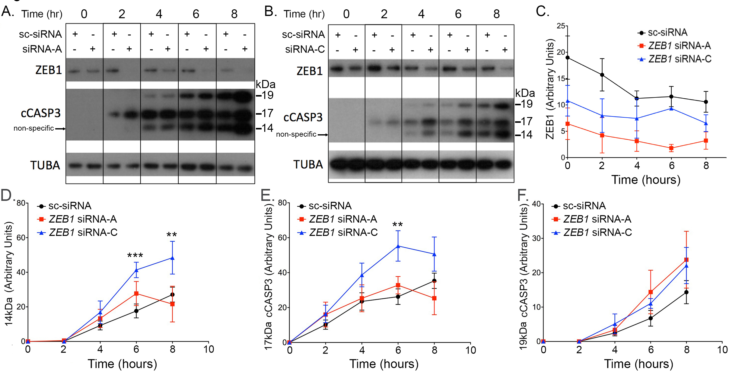 by the appearance of cleaved caspase 3 (cCASP3) with western blotting. C: ZEB1 knockdown was assessed with western blotting, quantified, and graphed. Abundance of the 14 kDa (D; non-specific), 17 kDa (E; active), and 19 kDa (F) fragments of cCASP3 was quantified with western blotting and graphed. Results represent three independent