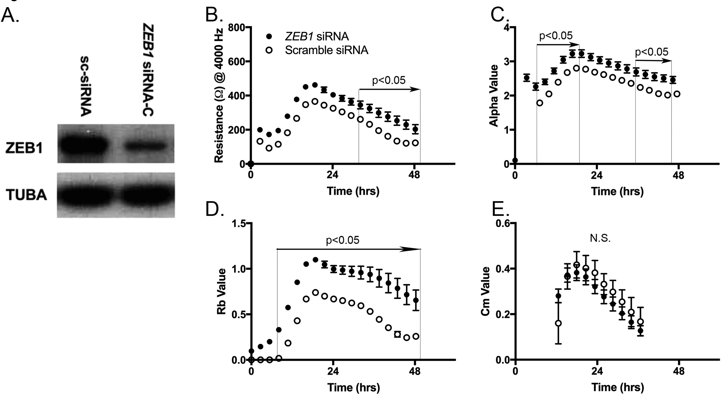 Figure 5. The impact of ZEB1 reduction on cell barrier function in in HCEnC-21T cells. A: HCEnC-21T cells were transfected with ZEB1 siRNA-C or scrambled siRNA (sc-siRNA), and knockdown of ZEB1 was confirmed with western blotting. B: Impedance (ohm) at 4,000 Hz, interendothelial resistance (Rb), cell attachment resistance (alpha), and plasma membrane capacitance