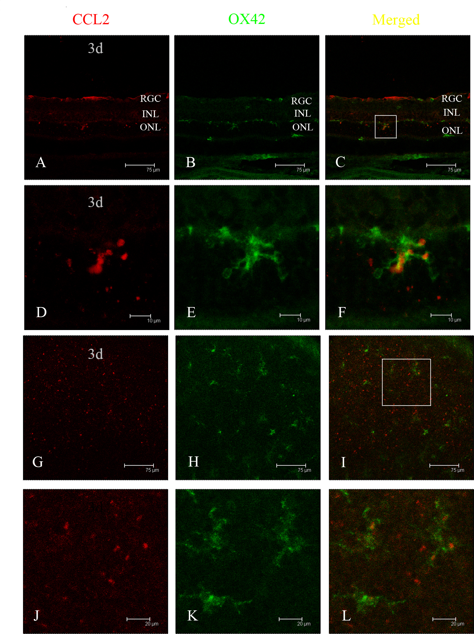 many OX42-positive cells were activated and migrated into the ONL and subretinal space. C: The merged image shows that CCL2 was colocalized in those activated and migrated microglia and monocytes. D, E, F: Amplified images of A, B, and C, respectively. G, H: In the retinal flat mount, CCL2 was expressed richly in the outer retina, where OX42-positive cells were found. I: The merged image shows that CCL2 was colocalized in those microglia and monocytes. J, K, L: Amplified images of G, H, and I, respectively.