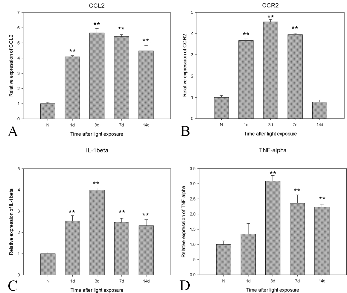 Figure 6. Real-time PCR of CCL2 and CCR2 and IL-1 beta and TNF-alpha expression after extensive light exposure. A, B: The mRNA of CCL2 and CCR2 began to increase as early as 1 day, peaked at 3 days, and slowly decreased. C, D: The expression pattern of interleukin (IL)-1 beta and tumor necrosis factor (TNF)-alpha was consistent with the patterns