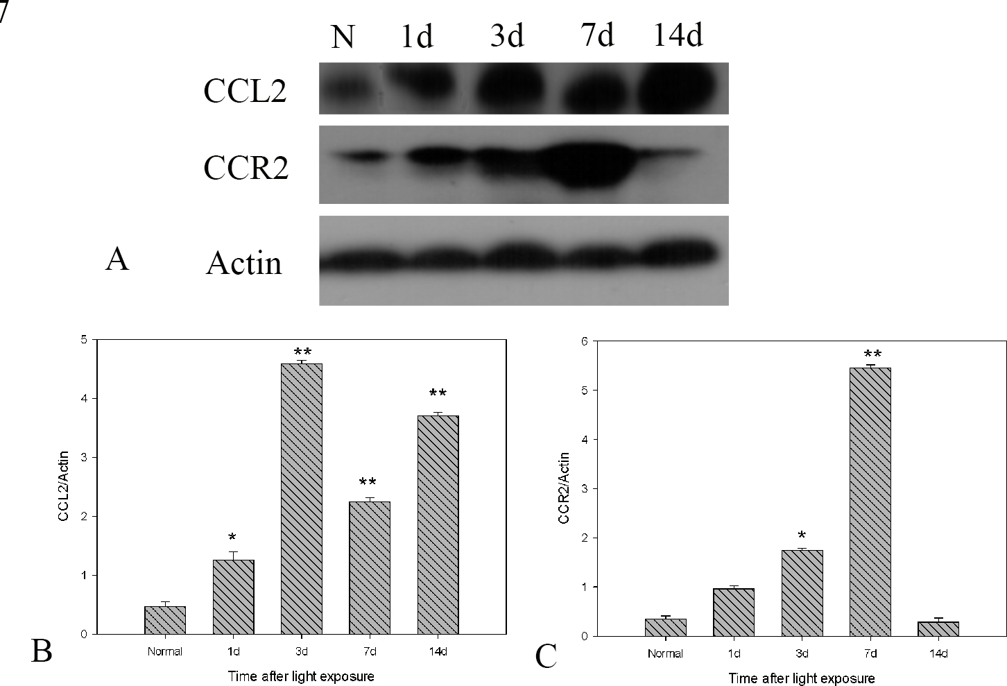 Figure 7. Western blot analysis of CCL2 and CCR2 expression after extensive light exposure. A, B: CCL2 protein expression began to increase at 1 day and peaked at 3 days. A, C: CCR2 protein expression began to increase at 3 days and peaked at 7 days after light exposure. Actin protein expression