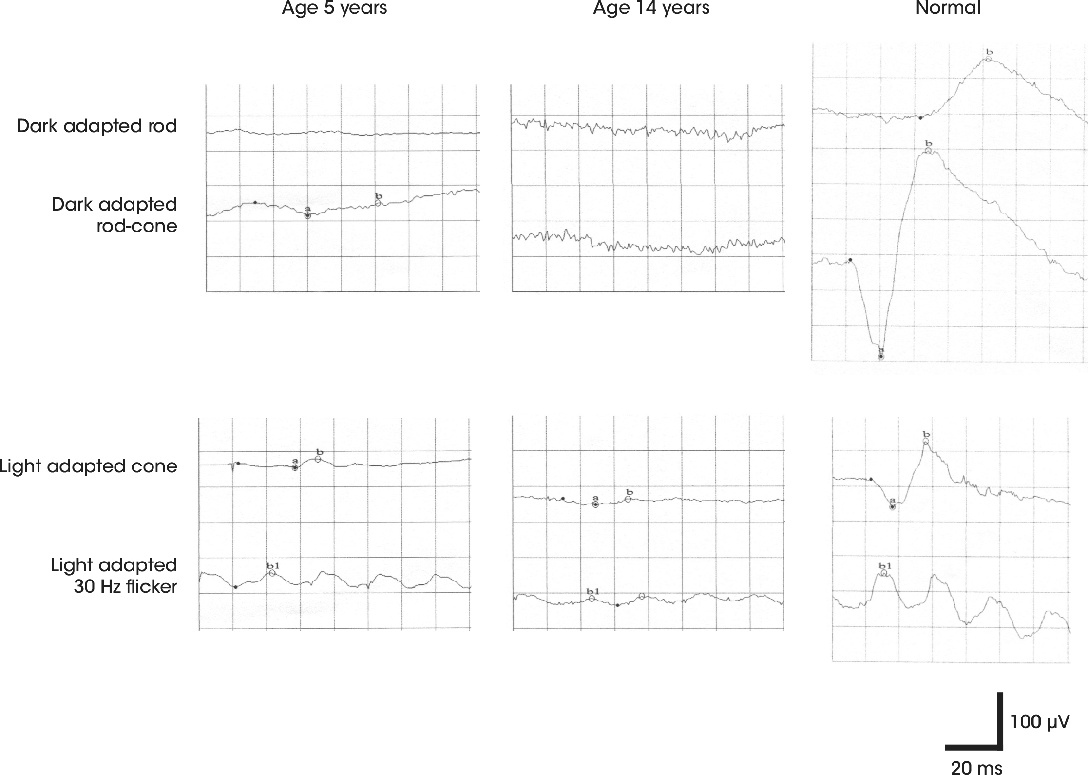 reduced cone responses, compared to normal). ms = milliseconds; µV = microvolts.