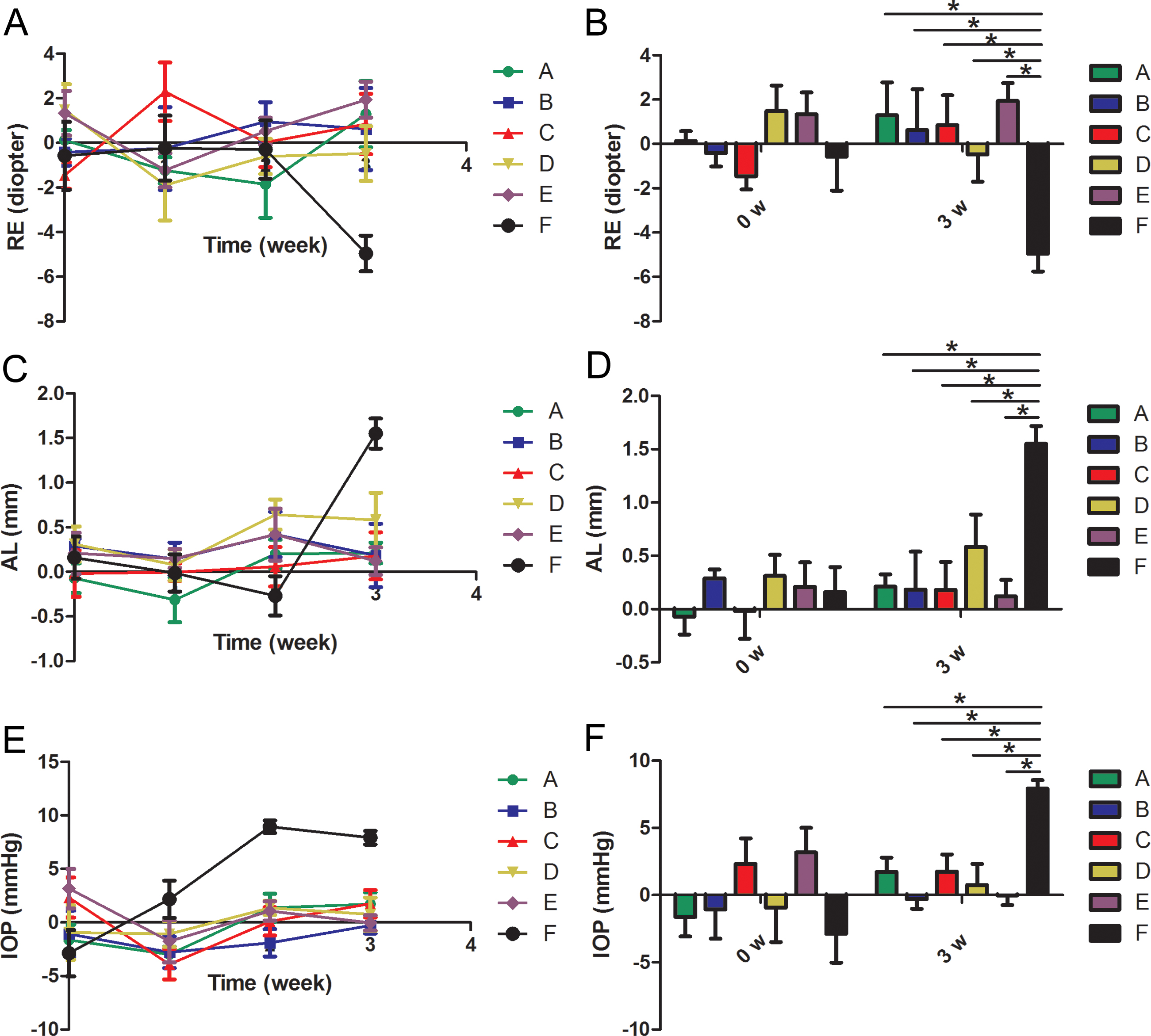 error (RE), axial length (AL), and intraocular pressure (IOP) during the experiment in groups A through F is shown. All values