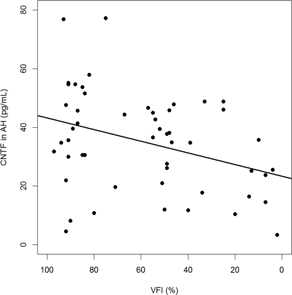 Plot of the CNTF concentration in aqueous humor versus the Humphrey visual field index. The solid line represents the linear regression fit. Note the reversed x-axis.